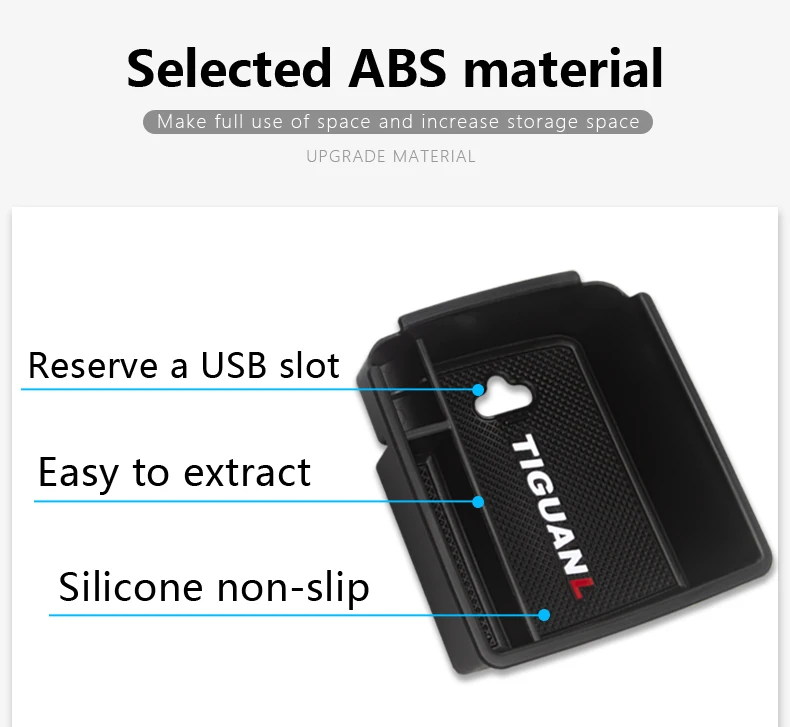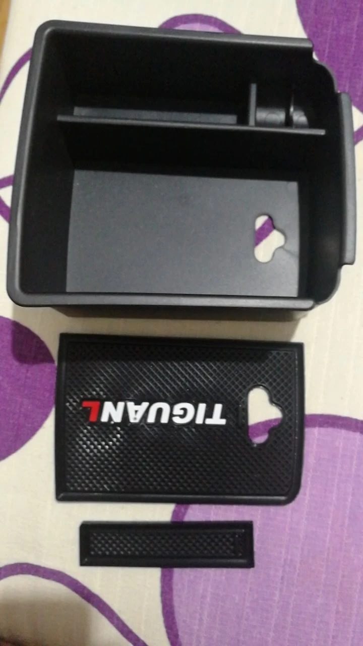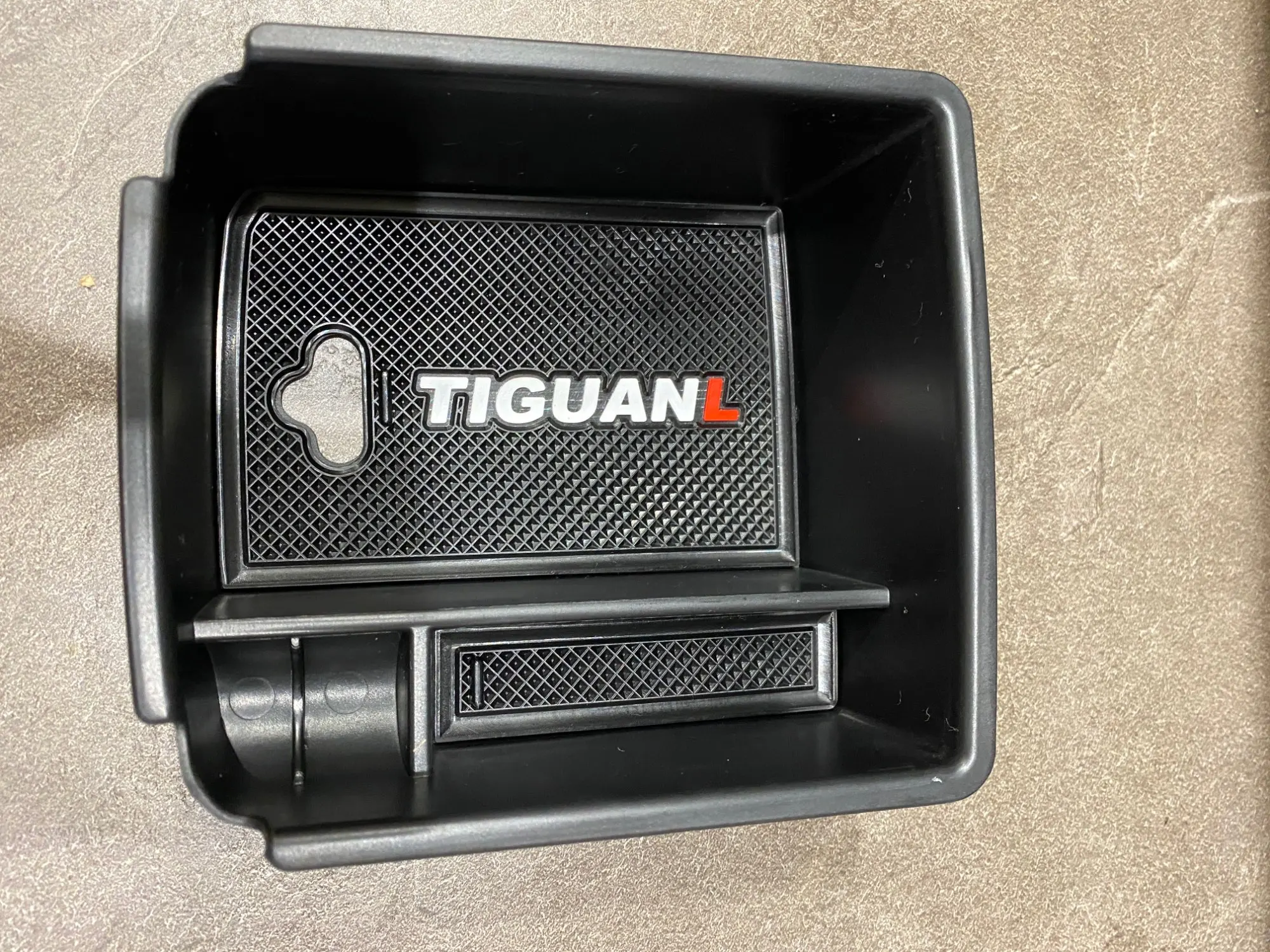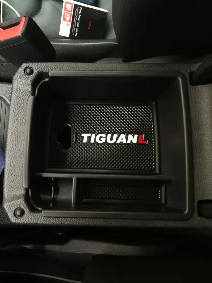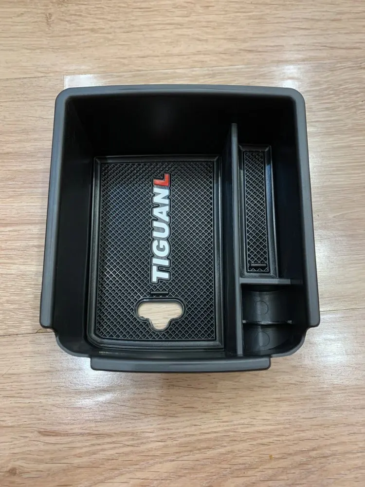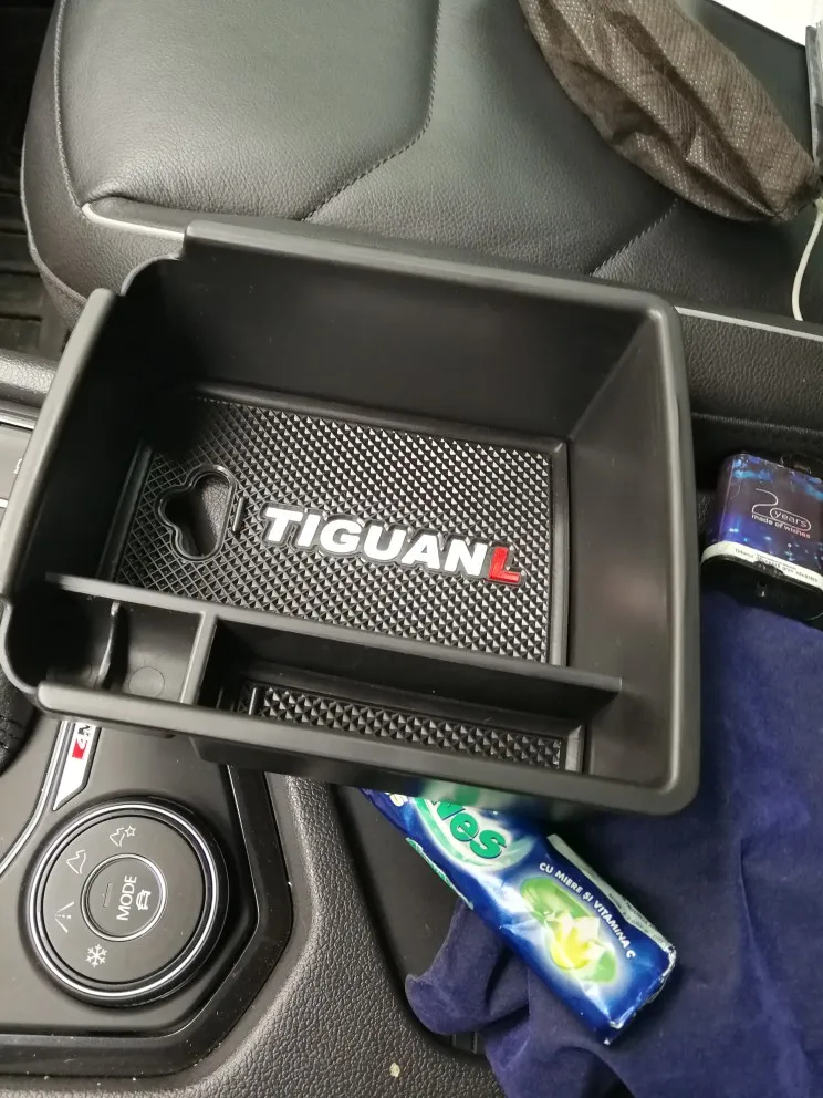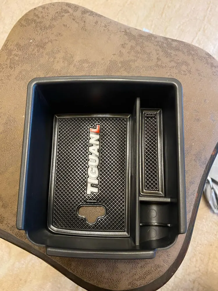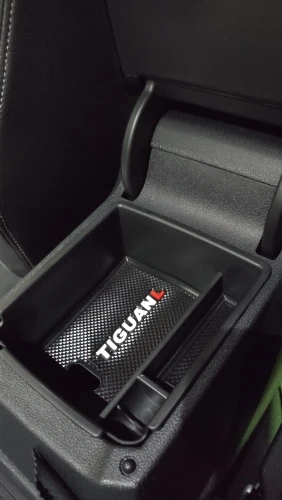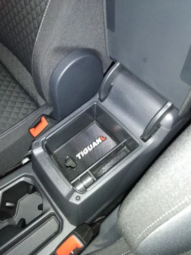 Queda perfectamente en el Tiguan all space del año 18, da un notable aprovechamiento del espacio y puedes poner las cosas más pequeñas o dejar la cartera. Tiene plastico antideslizante y un hueco para poner monedas.