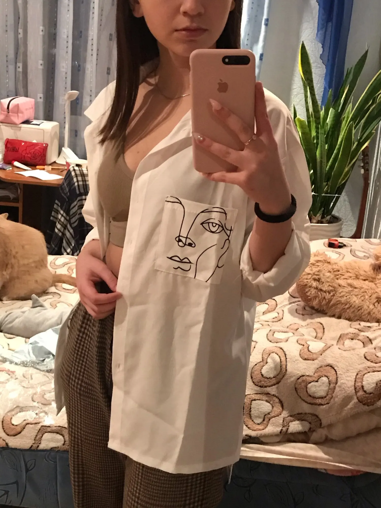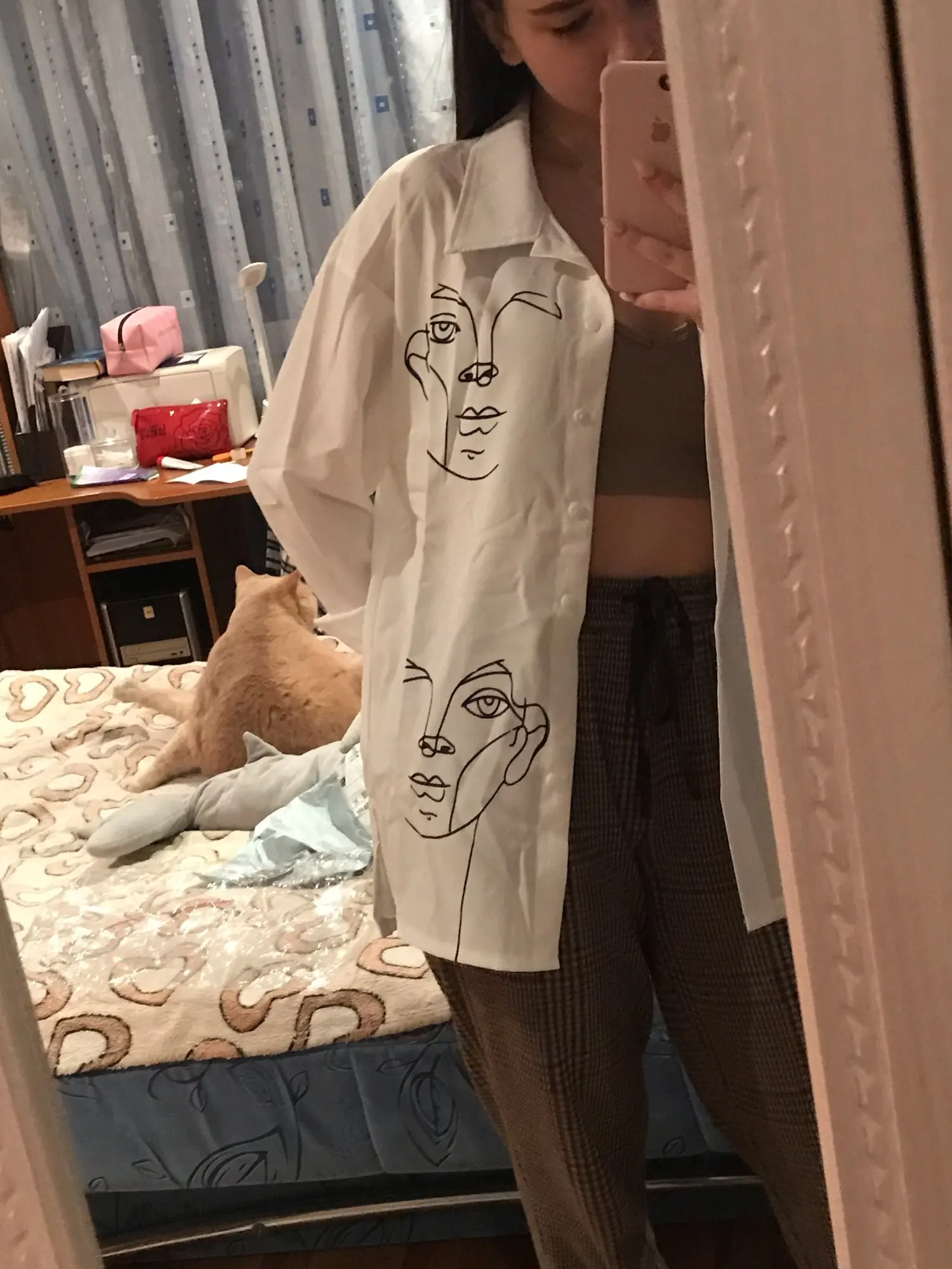 Женская хлопковая блузка, белая рубашка в стиле ретро с принтом лица и длинным рукавом, весна-лето
