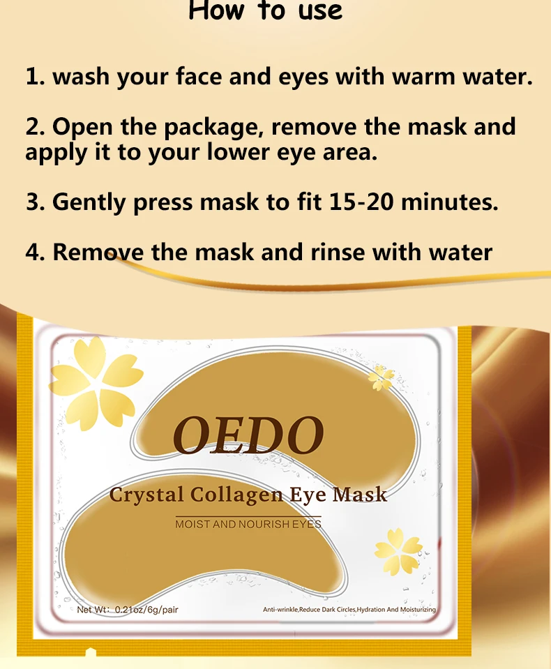1. Вымойте лицо и глаза в тепле.2. Откройте посылка, снимите маску и нанесите ее на нижнюю область глаз.3. Аккуратно нажмите маску для 15-20 минут.4. Удалите маску и краску водой