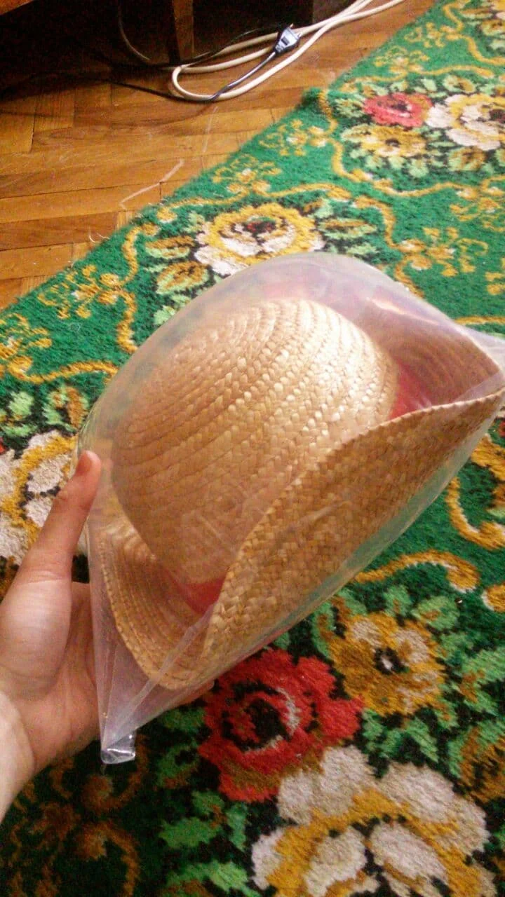 Шляпа пришла помятой, плюс кривовато прилеплена ленточка, торчит в нескольких местах солома. Но в целом товар своей цене соответствует.