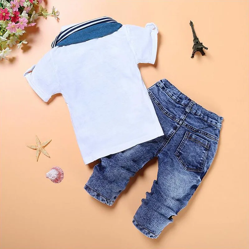 Летняя детская одежда 2021, хлопковая футболка с коротким рукавом для мальчиков, топы, джинсовый шарф, 3 шт., детский повседневный комплект, яркий новый милый наряд для младенцев