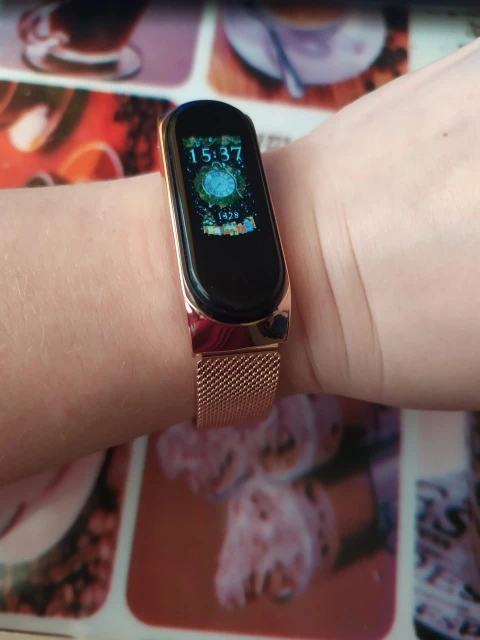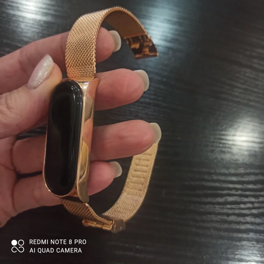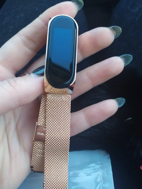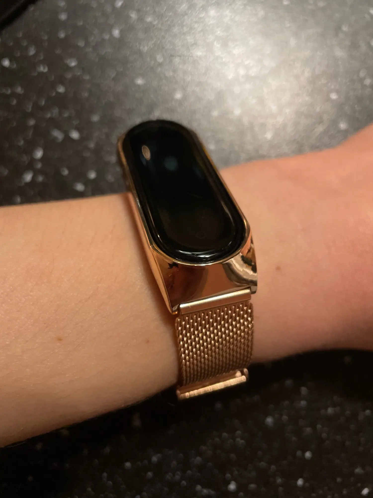 Браслет для Mi Band 5 Идеально подходит, выглядит более элегантно по сравнению с силиконовым ремешком. Золотой цвет на самом деле поставляется в розовом золотом, чем желтое золото, что мне нравится. Mi Band очень хорошо сидит в брэнсоле, не беспокойтесь о zgubienia.