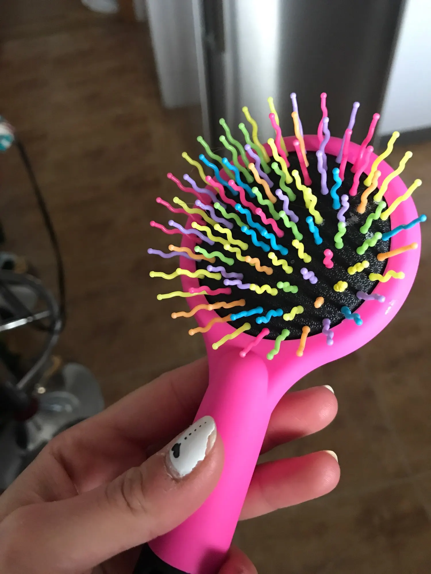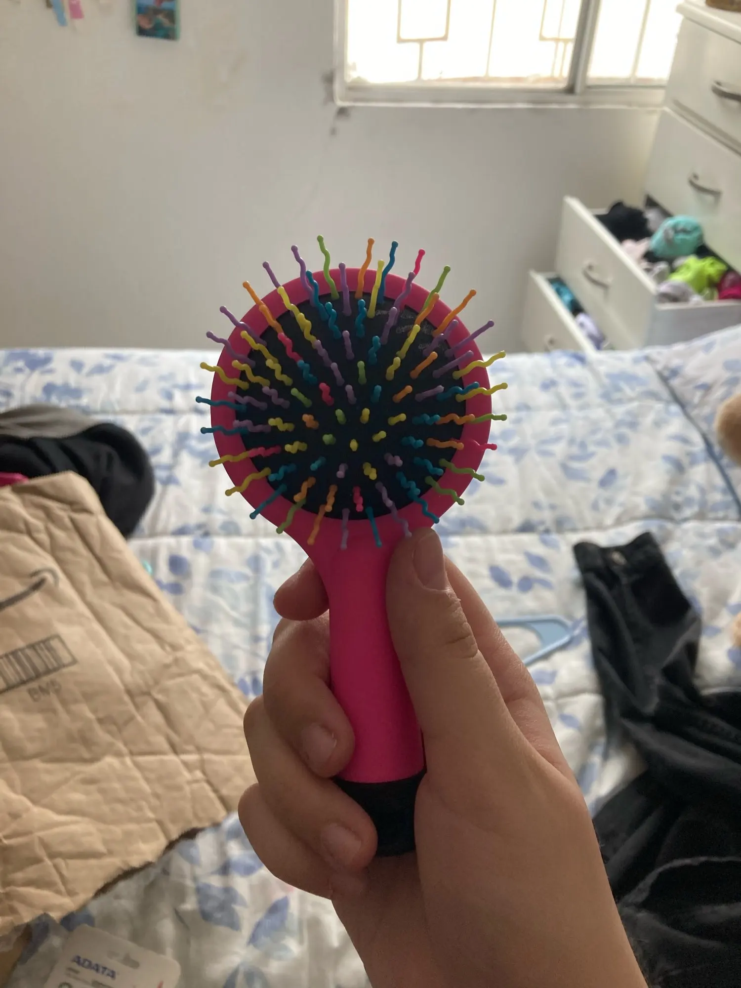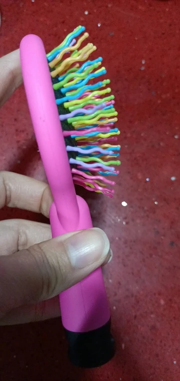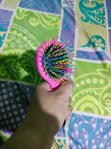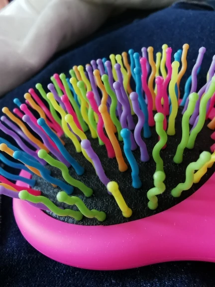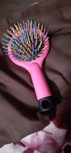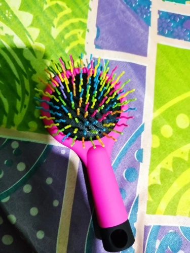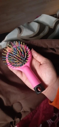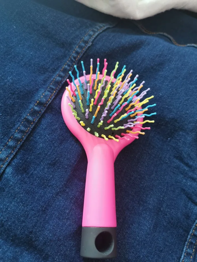 Es de un tamaño pequeño, las formas de las cerdas permiten desenredar el cabello y permiten que se hagan de manera más facil los rizos. LLegaron de manera rapida, fueron como 3 semanas.