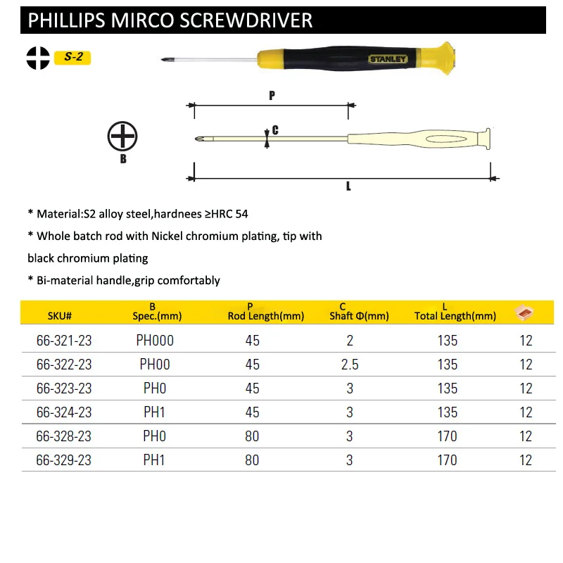 Мини-отвертка Stanley phllips PH000 PH00 PH0 PH1 для электронных часов, очков, инструментов для обслуживания телефонов, сталь S2, 1 шт.