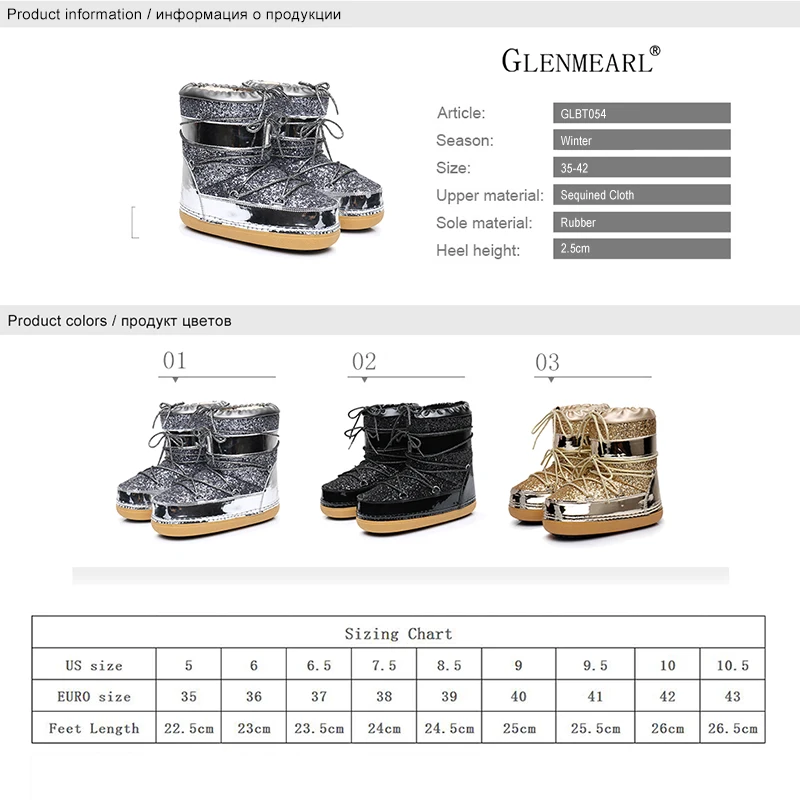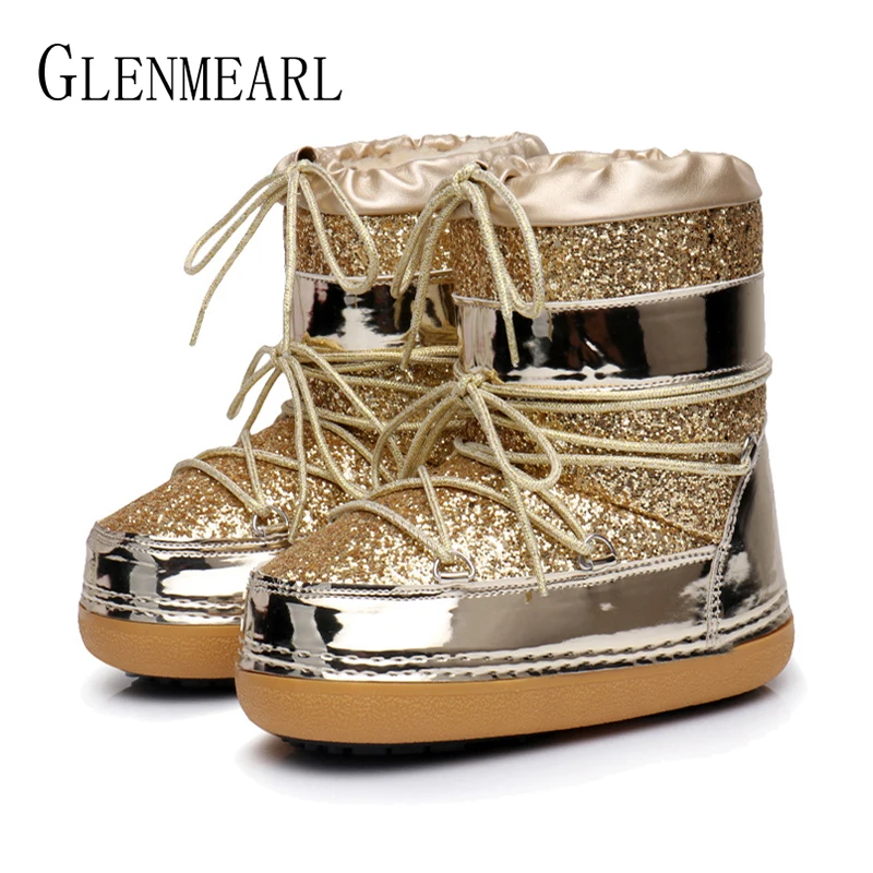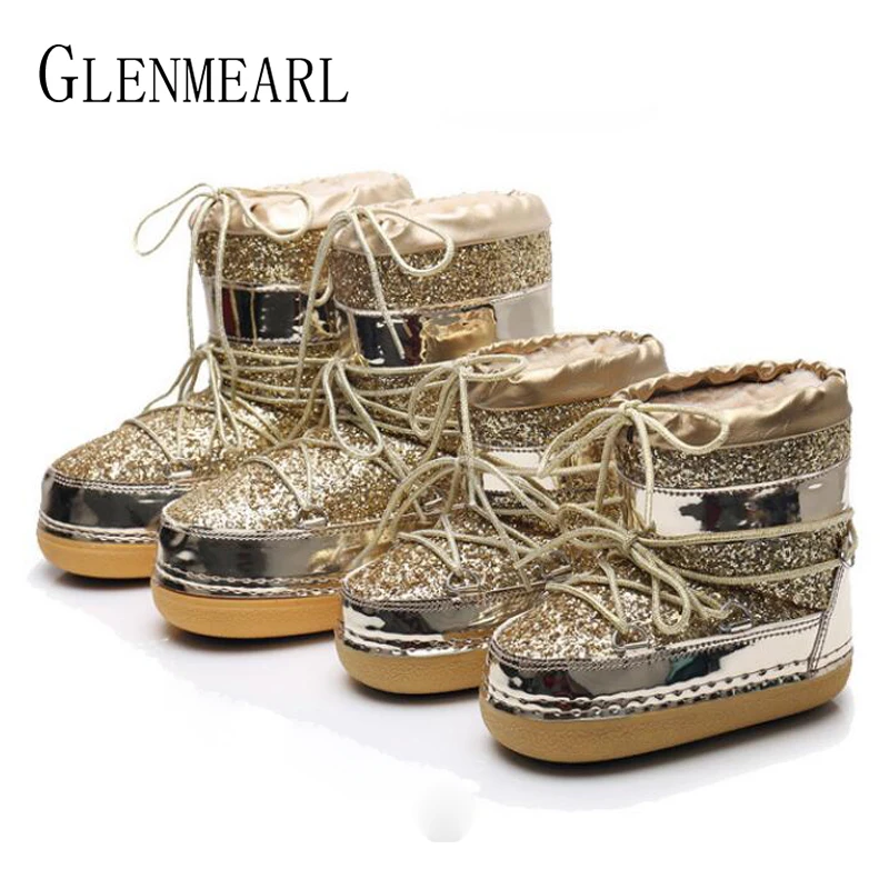 Женские ботинки на меху, зимние теплые ботинки до щиколотки, на нескользящей платформе, с золотистыми блестками, размера плюс
