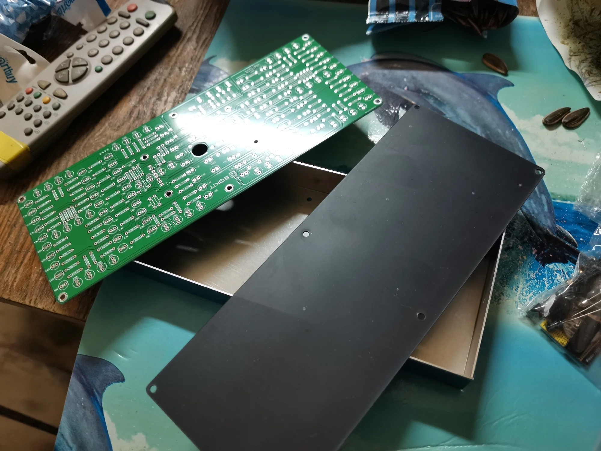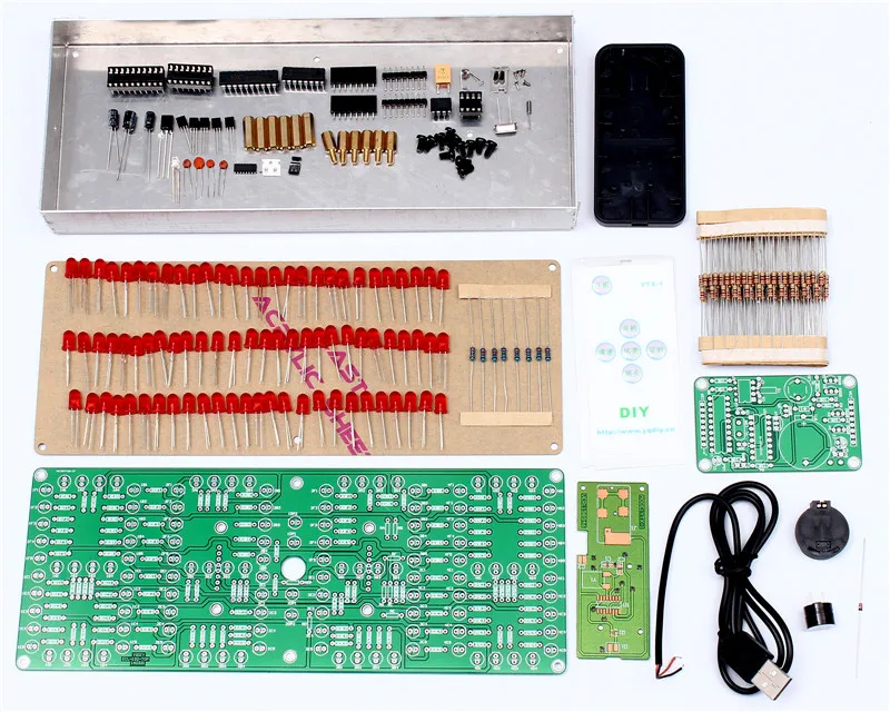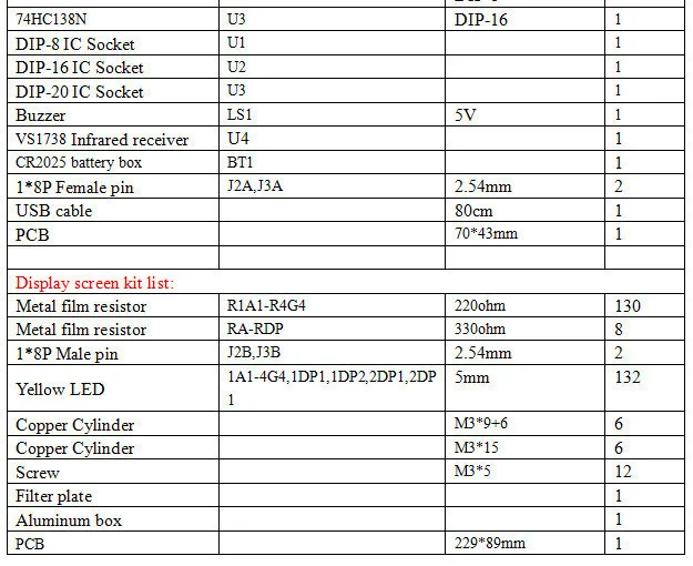А. Введение.1>. Это набор DIY. Пользователь должен сварить его.2>. ECL-132 часы с пультом дистанционного управления могут отображать часы 132 шт. 5 мм светодиодами. Размер каждого символа дисплея 81*43 мм (высокий * С). Весь размер дисплея 229*89 ммB. Обзор1>. Модель: ECL-1322>. Название: суперразмерный экран дисплей пульт дистанционного управления часы DIY Kit3>. Размеры: 233*93*30 мм4>. Рабочее напряжение: 5 В (Питание от USB)5>. Рабочий ток: 30-50 мА (зависит от цвета дисплея)C. ИнструкцияПримечание: на пульте дистанционного управления есть 6 кнопок, но только 5 кнопок функциональны. Верхняя кнопка не имеет функции.1. Функция кнопки.Средняя кнопка: главное меню.Верхняя кнопка: увеличениеНижняя кнопка: уменьшитьПравая кнопка: правильные опцииЛевая кнопка: Левая кнопка1). Настройка подменю времени: мигающий светодиодный индикатор-это выбранные биты. Правый 2 бит может регулировать часы, а левый 2 бит может регулировать минуты другими четырьмя кнопками. Нажмите среднюю кнопку сохранения и закройте эти опции и введите в меню настройки будильника.2). Настройки будильника подменю:Это главный выключатель для 5 каналов аварийного в первую очередь. Первый бит отображает «C» и последние 2 бит мигают и отображают «on» или «OF». Верхняя кнопка и нижняя кнопка могут включаться/выключаться. Если выбрать «из», нажмите среднюю кнопку «войти», чтобы исправить ошибки в подменю. Если выбрать «on», нажмите среднюю кнопку, чтобы установить сигнал Первого канала. Первые 2 бит отображают «C1» и последние 2 бит мигают и отображают «on» или «OF». Верхняя кнопка и нижняя кнопка могут включаться/из. Если выбрать «из», нажмите среднюю кнопку, чтобы установить Второй канал тревоги. Если выбрать «on», нажмите среднюю кнопку, чтобы задать время и минуты. Мигающий светодиодный индикатор-это выбранные биты тока. Правая 2 бит может регулировать часы, а левая 2 бит может регулировать минуты другими четырьмя кнопками. Правая кнопка и левая кнопка могут выбрать час и минуты. Верхняя кнопка и кнопка buttom могут установить время будильника. Затем нажмите среднюю кнопку для установки второго канала сигнализации. Затем установите другие сигналы тревоги такими же шагами. После установки сигнализации fitth нажмите среднюю кнопку enter для коррекции ошибок в подменю.3). Подменю для коррекции ошибок:Первый бит отображает «n» и последние 2 бит мигают и отображают «on» или «OF». Верхняя кнопка и нижняя кнопка могут включаться/выключаться. Если выбрать «из», нажмите среднюю кнопку для нормального отображения.Если выбрать «on», нажмите среднюю кнопку для настройки параметра коррекции. Последние 2 бит мигают и представляют дни. Затем нажмите середину, чтобы задать секунду. Затем нажмите среднюю кнопку для нормального отображения.2. Кнопки имеют ярлыки1). При нормальном состоянии дисплея нажмите верхнюю кнопку, чтобы закрыть или открыть дисплей.2). При нормальном состоянии дисплея нажмите кнопку «buttom», чтобы переключить отображение часов/минут или минут/секунд. (четыре светодиода посередине не будут мигать или гореть в режиме минуты/секунды).3). На нормальном состоянии дисплея, нажмите левую кнопку можно установить 5-канал сигнала тревоги.4). При нормальном состоянии дисплея Нажмите правую кнопку для коррекции секунды, светодиодный индикатор отобразит «ESC», через несколько секунд отобразит мигание минут/секунд и секунд. И через нескол