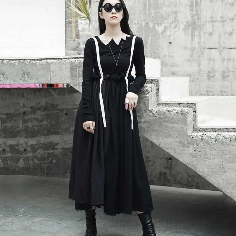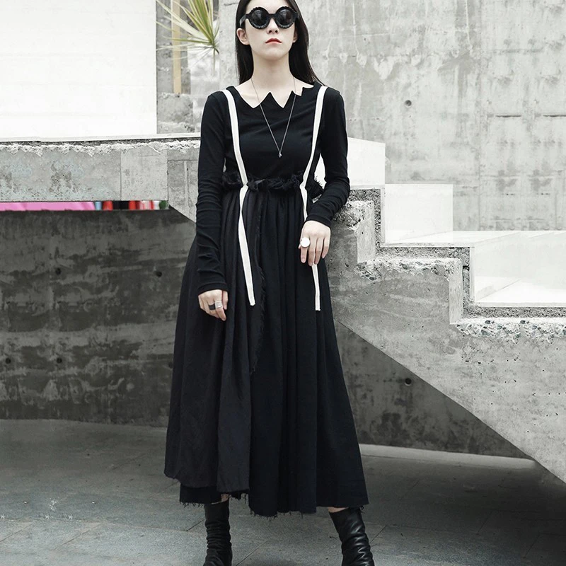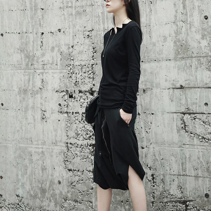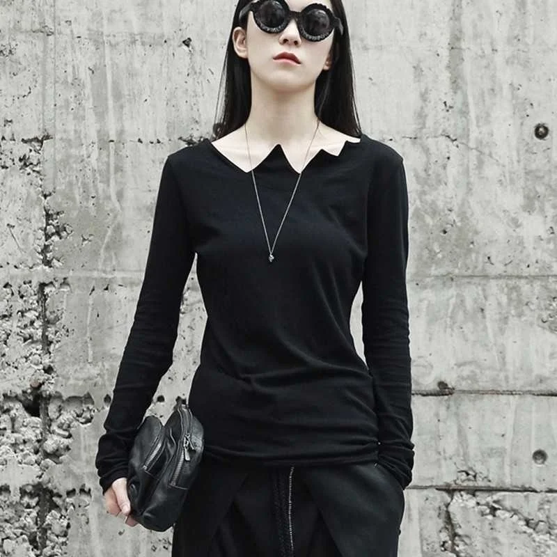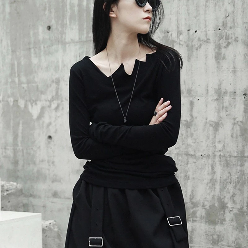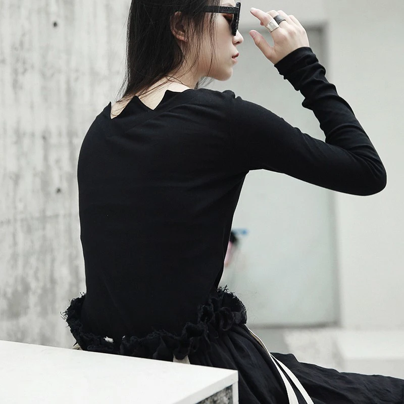 Женская Повседневная Асимметричная футболка EAM, черная короткая футболка с круглым вырезом и длинным рукавом, весна-осень 2022, LA922