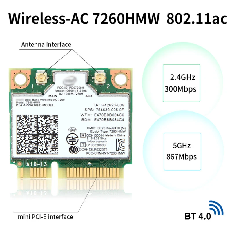 Состояние: абсолютно новыйМодель: 7260HMWТип: 802.11ac и Bluetooth-Совместимость 4,0Поддержка операционных систем ed: Windows 7/8/10 (WinXP и Vista Linux не поддерживают)(Половина MINI PCI-E. Для завинчивания карты может потребоваться полный размер.)Совместим с: он может использоваться на Samsung/Dell/Sony/ACER/ISUS/MSI/Clevo/Terransforce/Hasee и т. Д. (не включает lenovo,IBM и HP, если он может использоваться после перезаписи белизны).