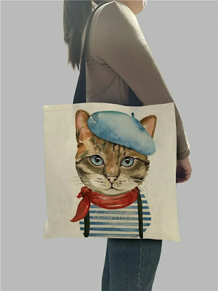 Многоразовые сумки для покупок с милым принтом кошки, складная Женская Повседневная тканевая сумка, экологически чистая льняная школьная сумка