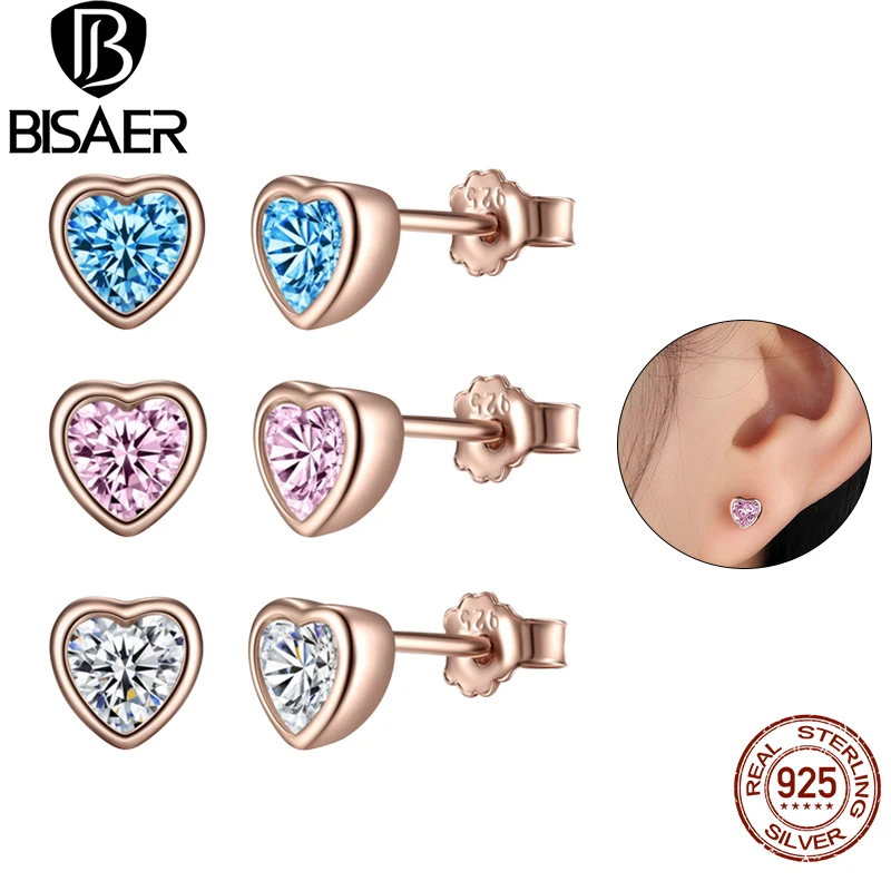 Серьги-гвоздики BISAER в форме сердца из стерлингового серебра 925 пробы, розовые серьги с кристаллами любви и цирконием для женщин, вечерние, свадебные, 2022 г., тонкие ювелирные изделия