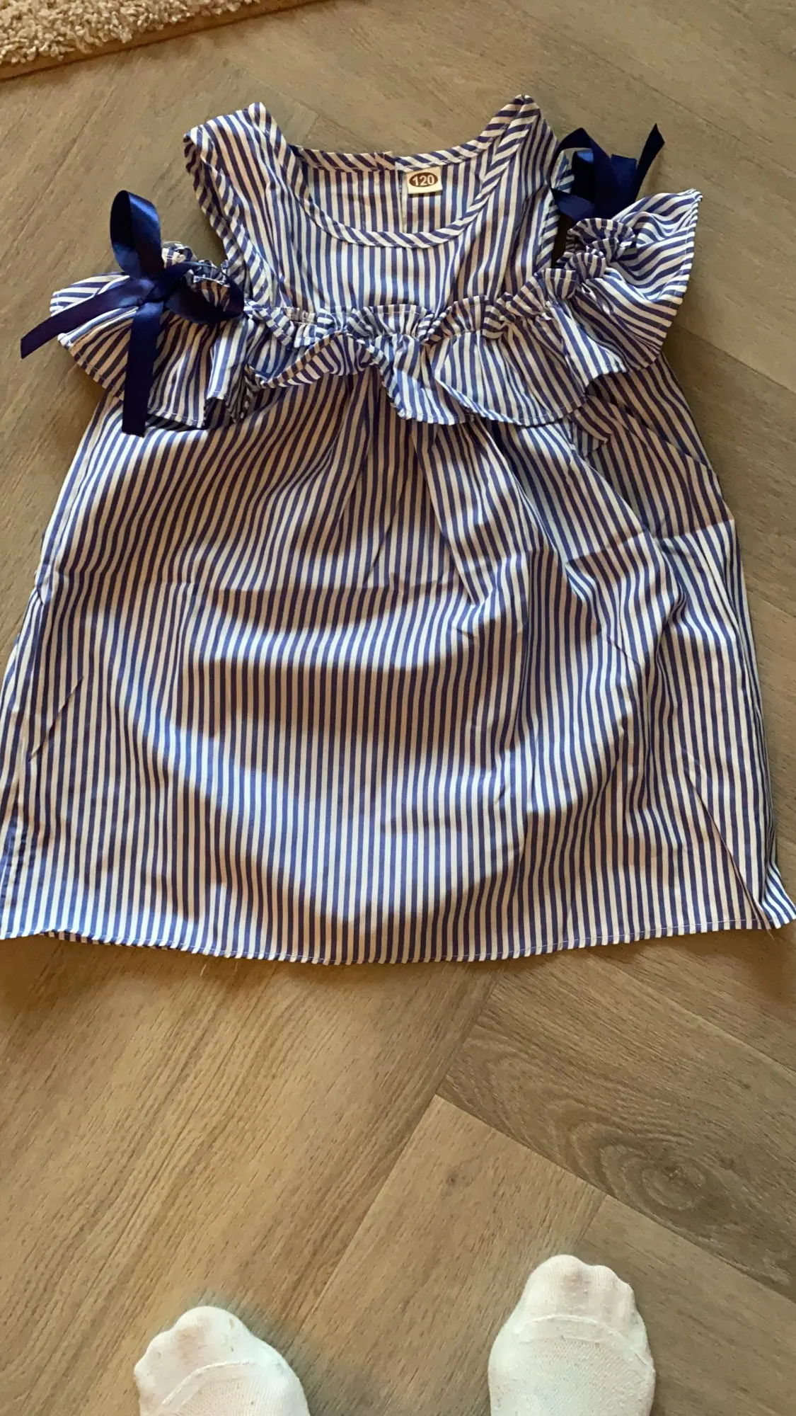 Платье детское летнее в синюю полоску, с открытыми плечами и оборками