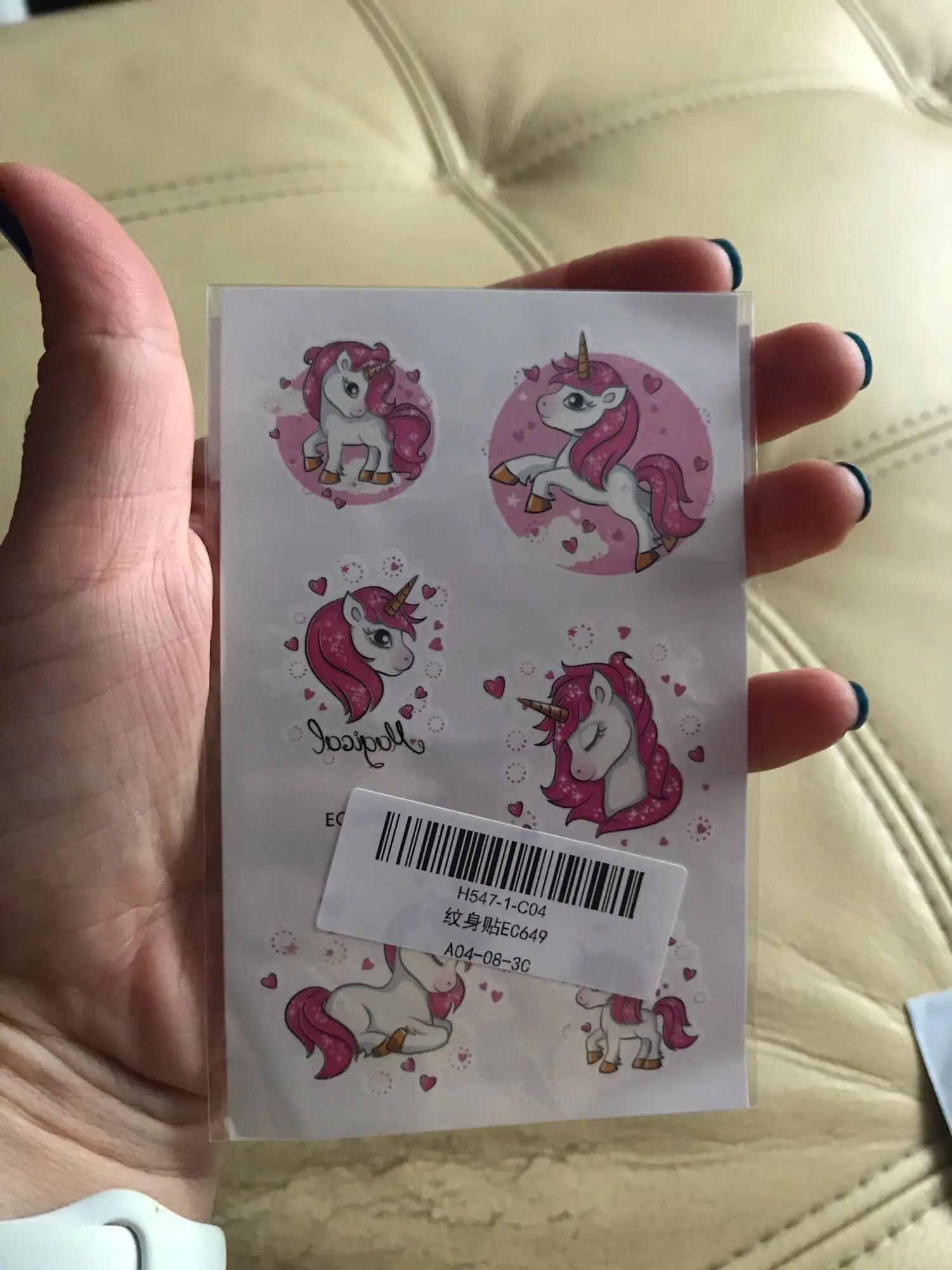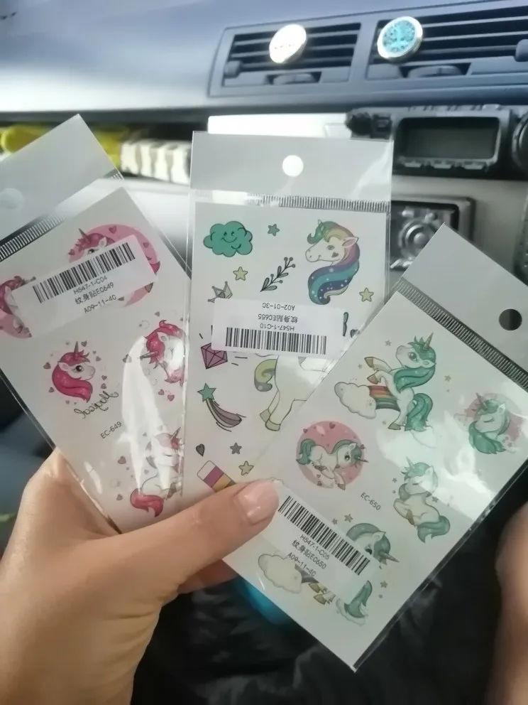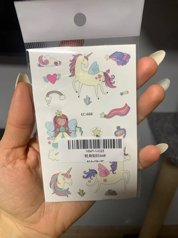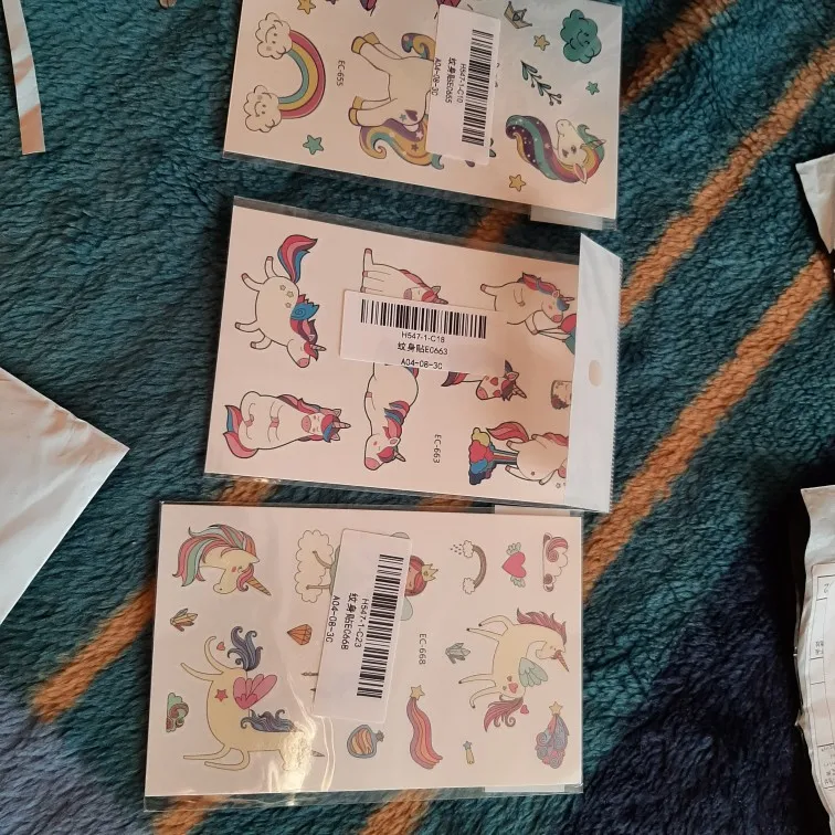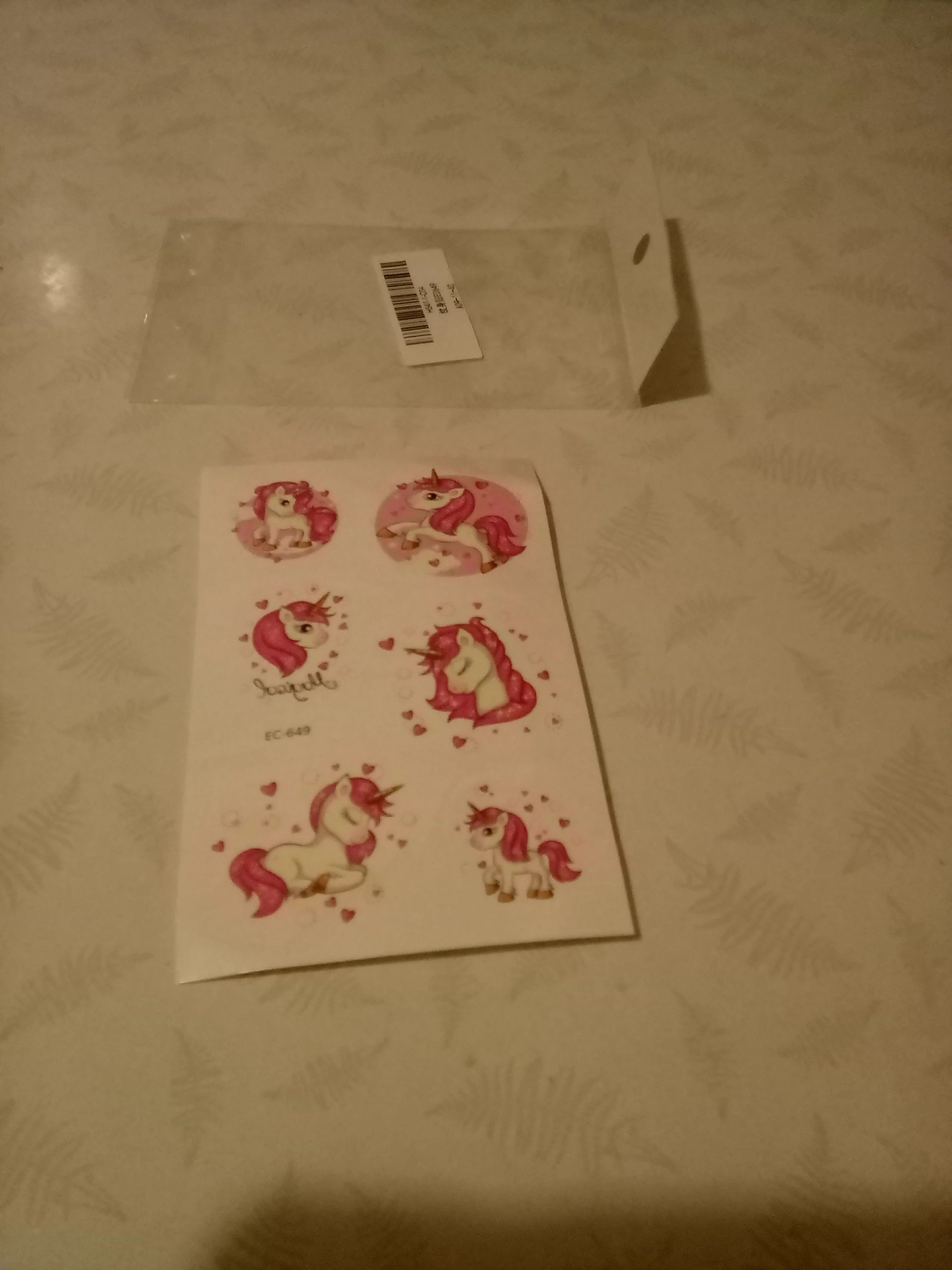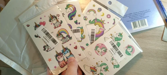 Посылка шла примерно месяц. Дочери очень понравились картинки. Переводятся легко, чуть бледноваты. Зато носятся долго, даже если с мылом мыть руки. Закажем ещё несколько штук. Классные.