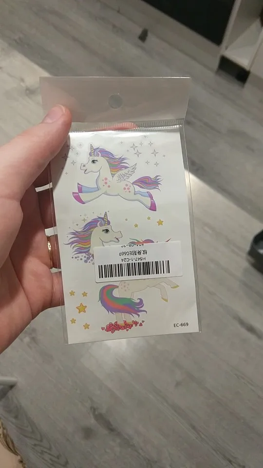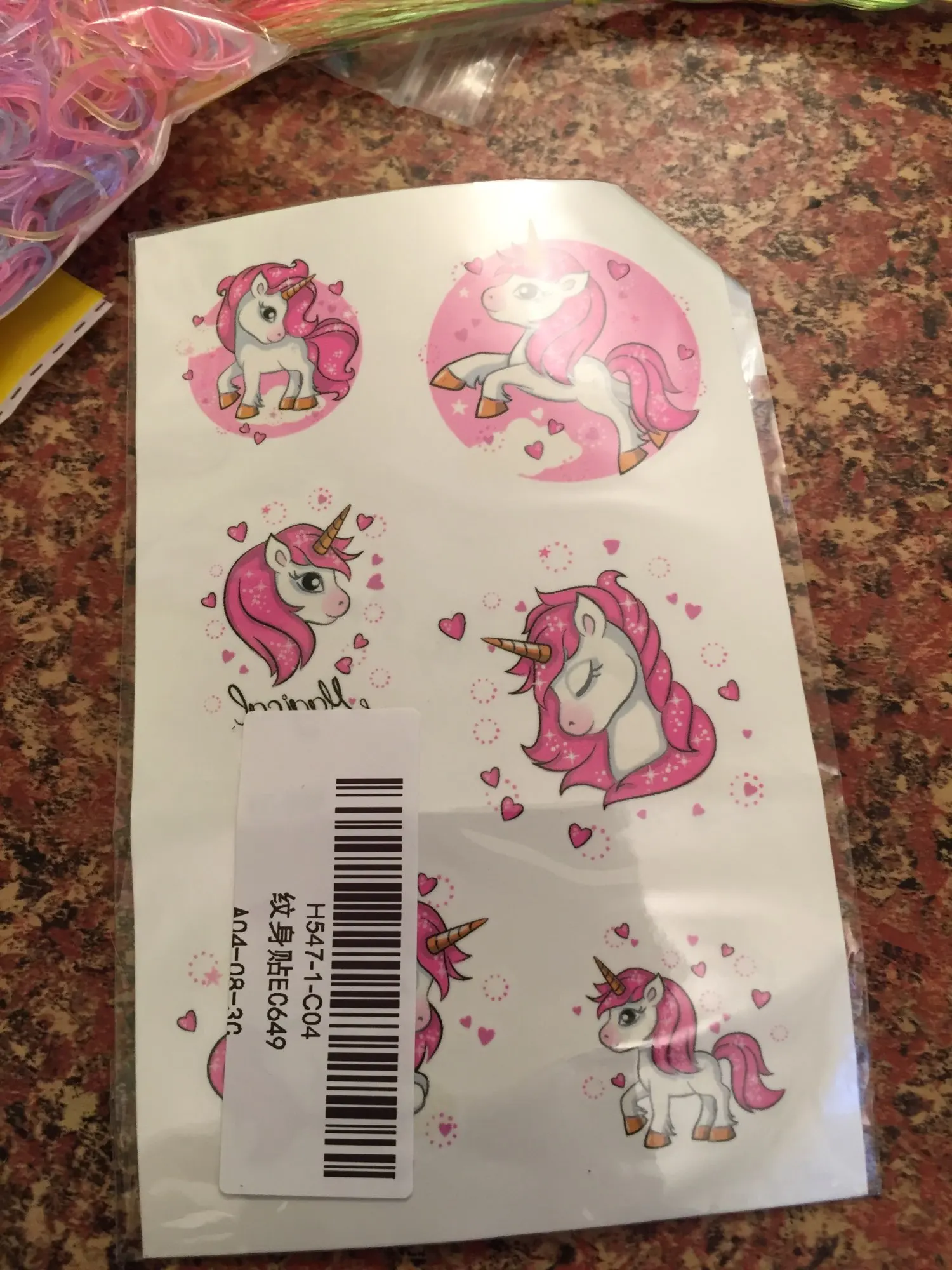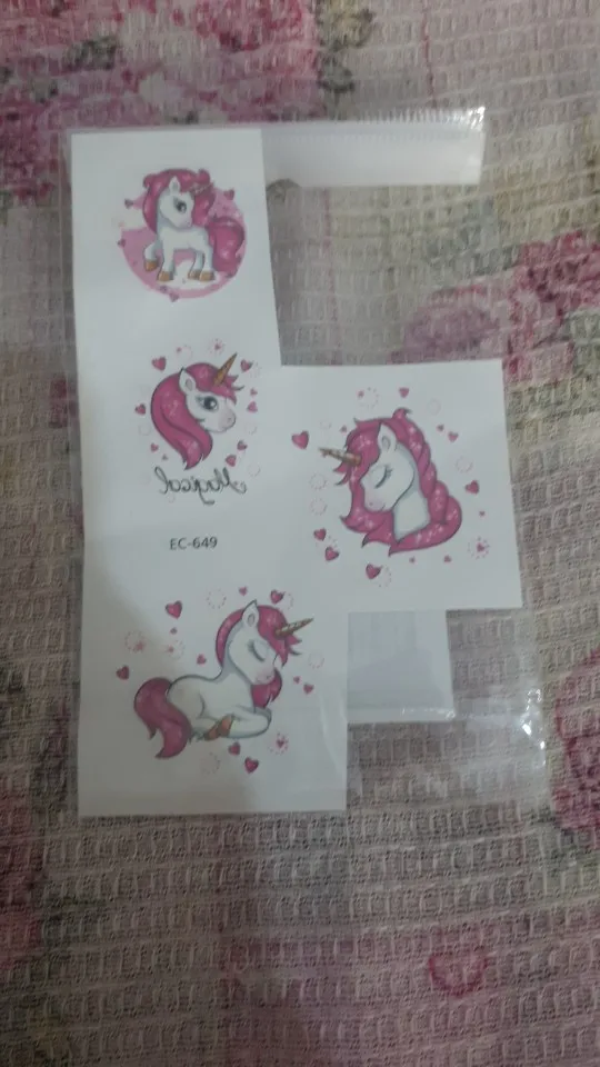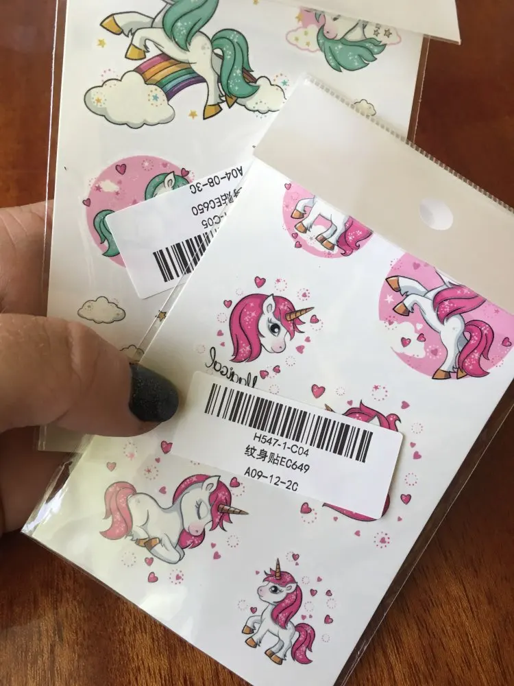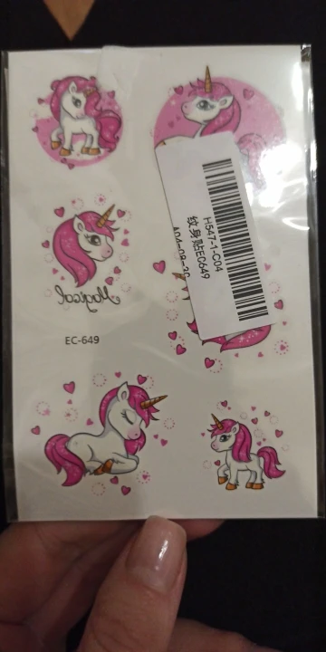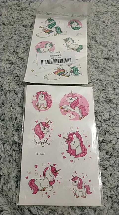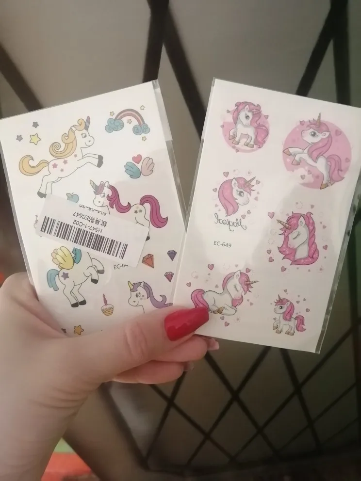 Посылка шла примерно месяц. Дочери очень понравились картинки. Переводятся легко, чуть бледноваты. Зато носятся долго, даже если с мылом мыть руки. Закажем ещё несколько штук. Классные.
