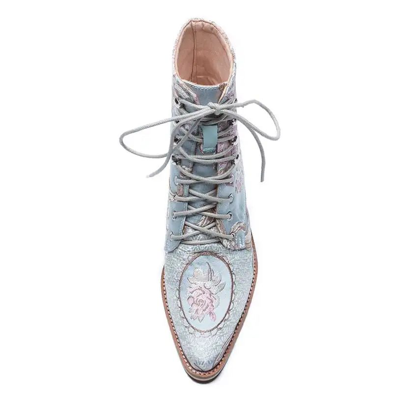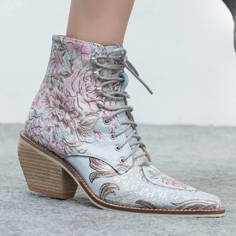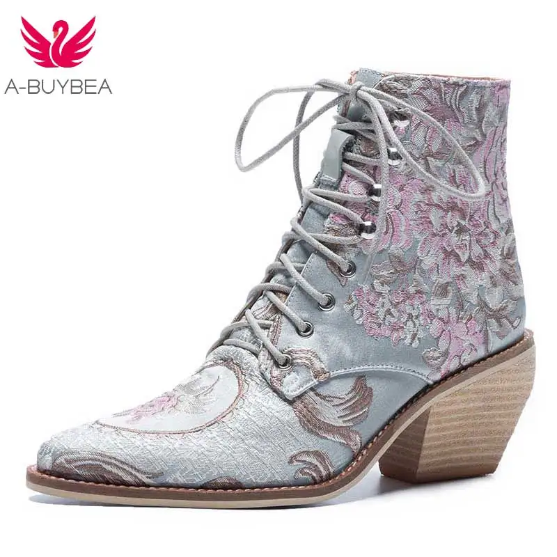 Ботильоны женские с цветочной вышивкой, повседневные шелковые атласные ботинки на высоком каблуке, со шнуровкой, полусапожки