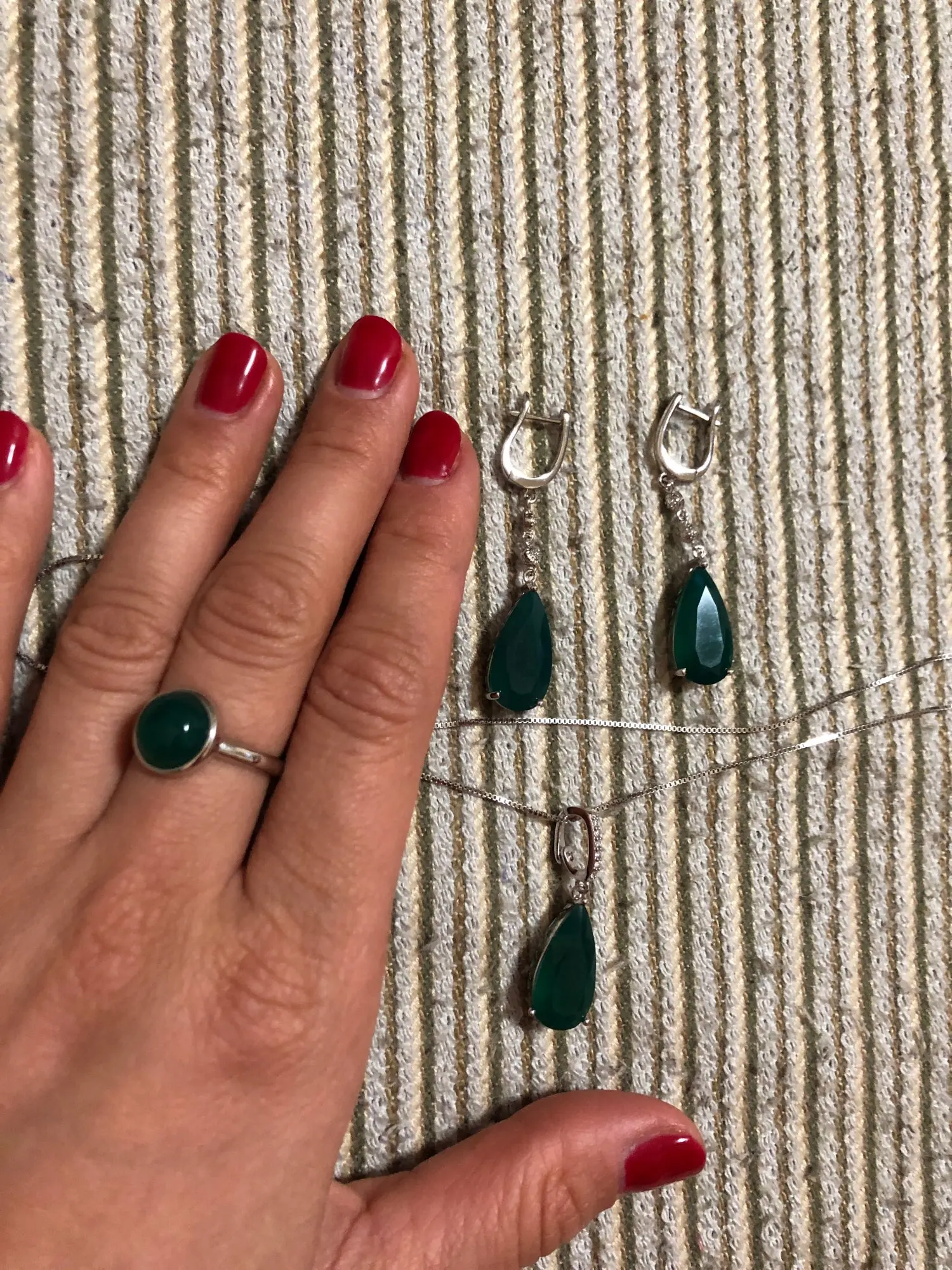 Пришло все быстро. К нарядному комплекту капелькой заказала круглое кольцо, так как посчитала, что предлагаемое к набору кольцо то уже перебор. И какое же оно классное. Носила бы и не снимала ))) все гладенькое, ровненькое, приятное. Качество и форма шикарные. Камень в реальности светлее, чем получается на фото. В подарок положили заколку.