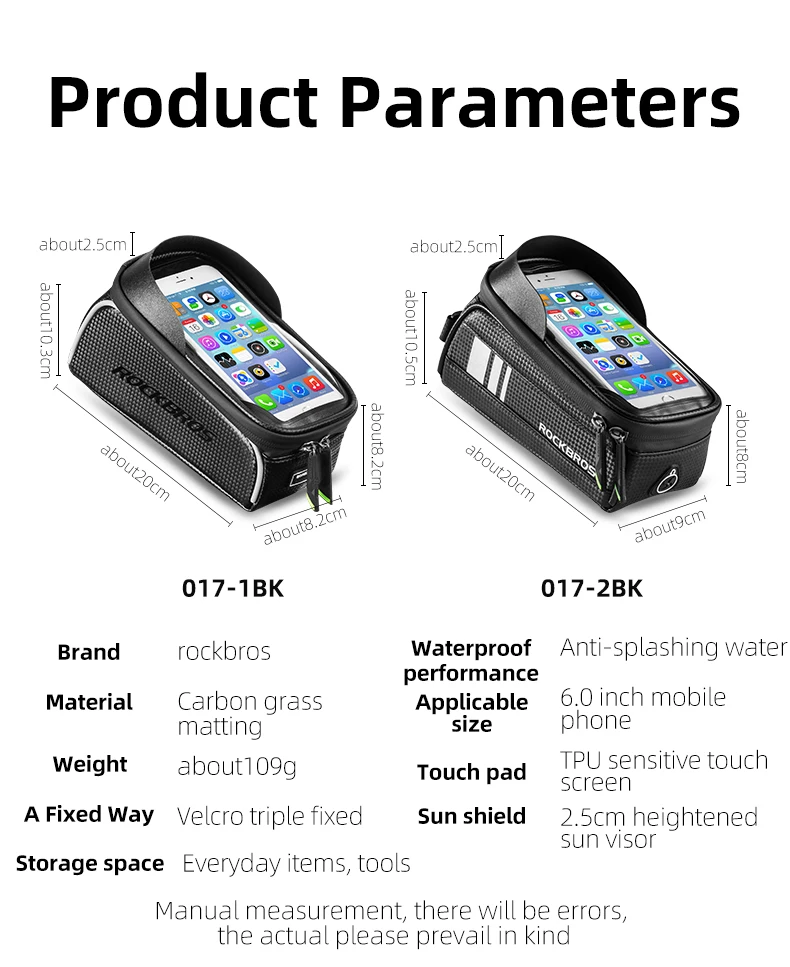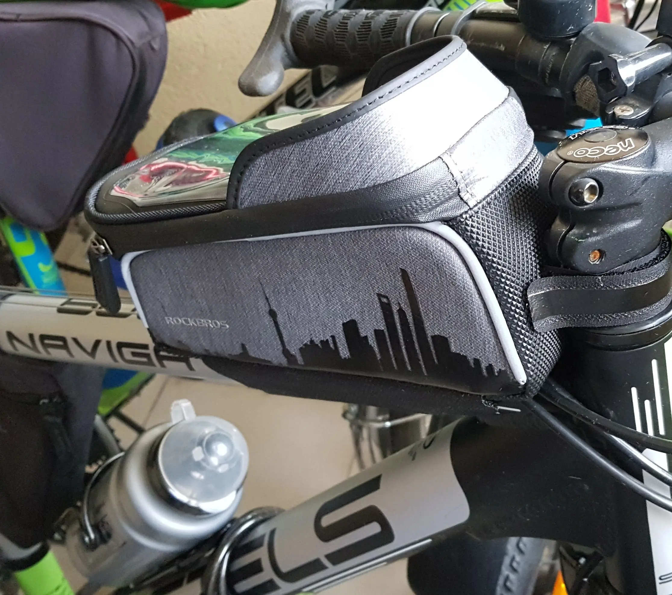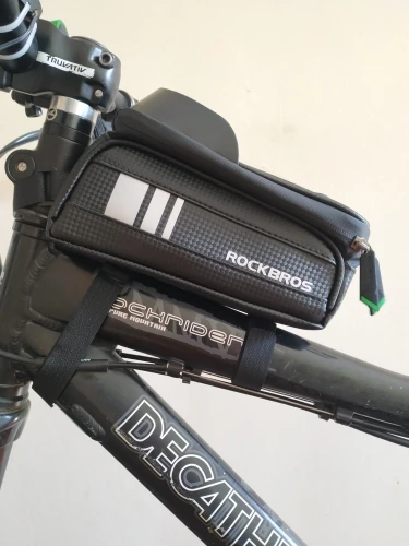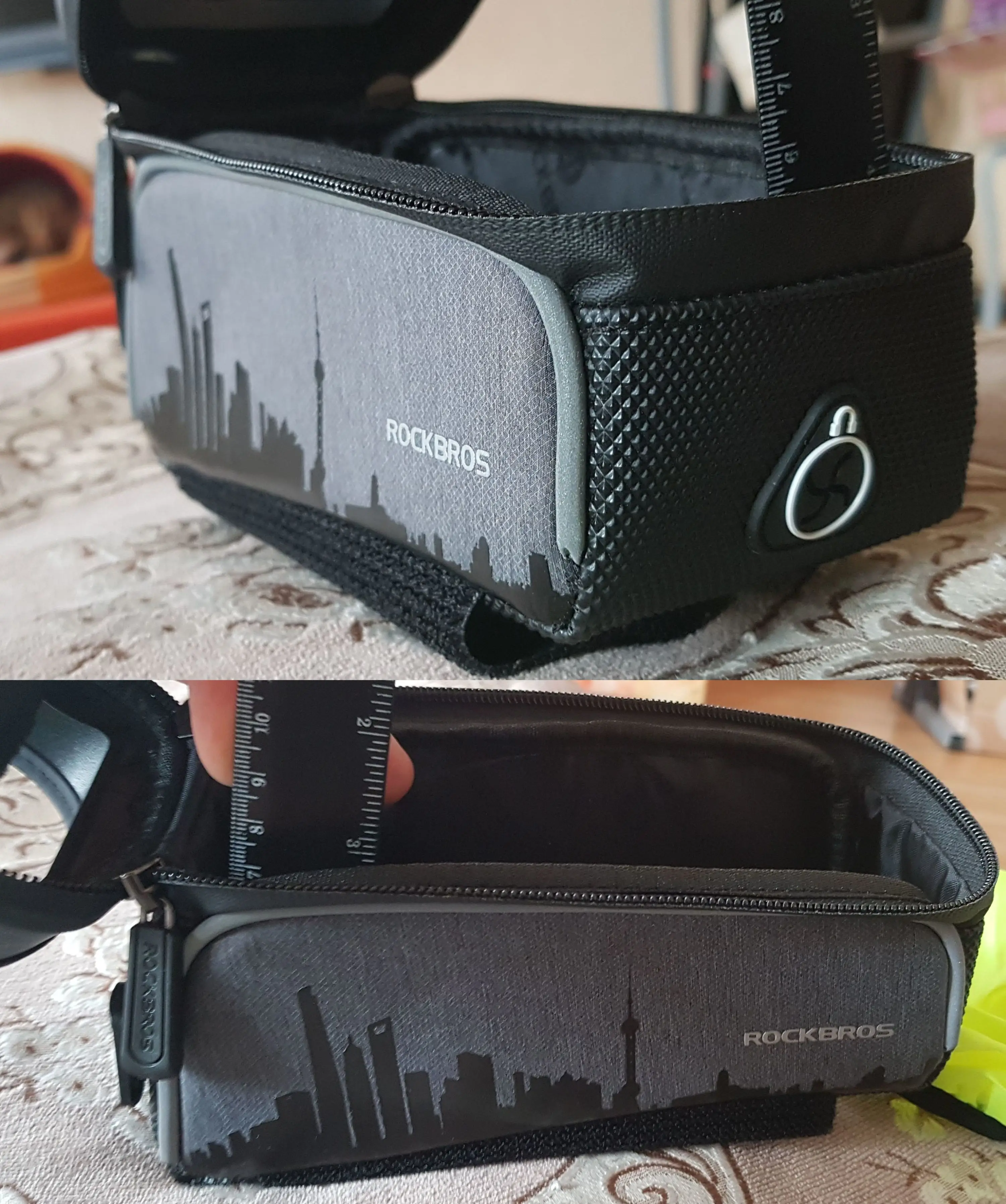 $ 14.36 (Color: 017-5) Покупаю для велосипедов только сумки ROCKBROS, т.к. качество на высоте, и мне важно, чтобы боковые стороны были твердые. Эти сумки водонепроницаемые (в комплекте есть доп. чехол от дождя, натягивается сверху. Также есть козырек (от бликов солнца немного защищает). Тач работает не особо чувствительно, но для пролистывания и вызова приложений вполне сойдет. Вмещаются телефоны с дисплеем 6.7 " в чехле. Сбоку шов сделан светоотражающей лентой. Замки с внутренней собачкой. В данной новой модели снизу липучка сплошная, но при желании можно разрезать, если мешает крепление тросиков. Так же в новой модели открывается сумка сверху, а не сбоку как в 017-1bk 6.0inch и 017-3bk 6.0inch. Отверстия для провода наушников зачем-то снизу имеется. Стирается сумка дочиста, пленка остается чувствительной на тач. За два сезона проблем не выявлено. Продавец спасибо!