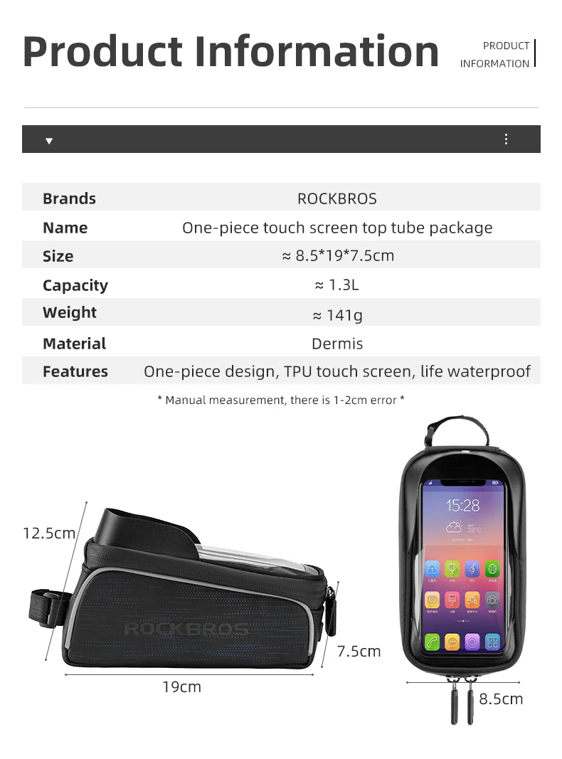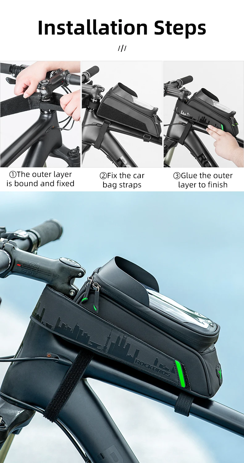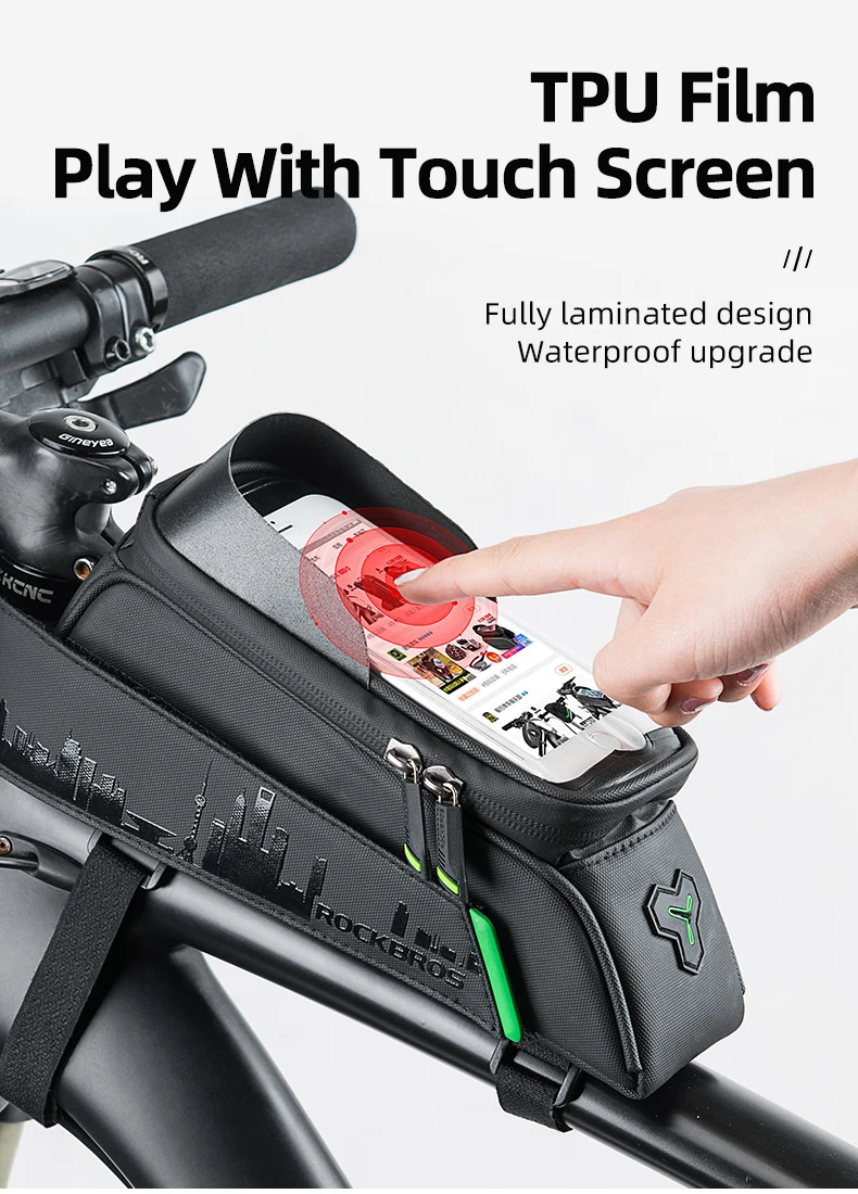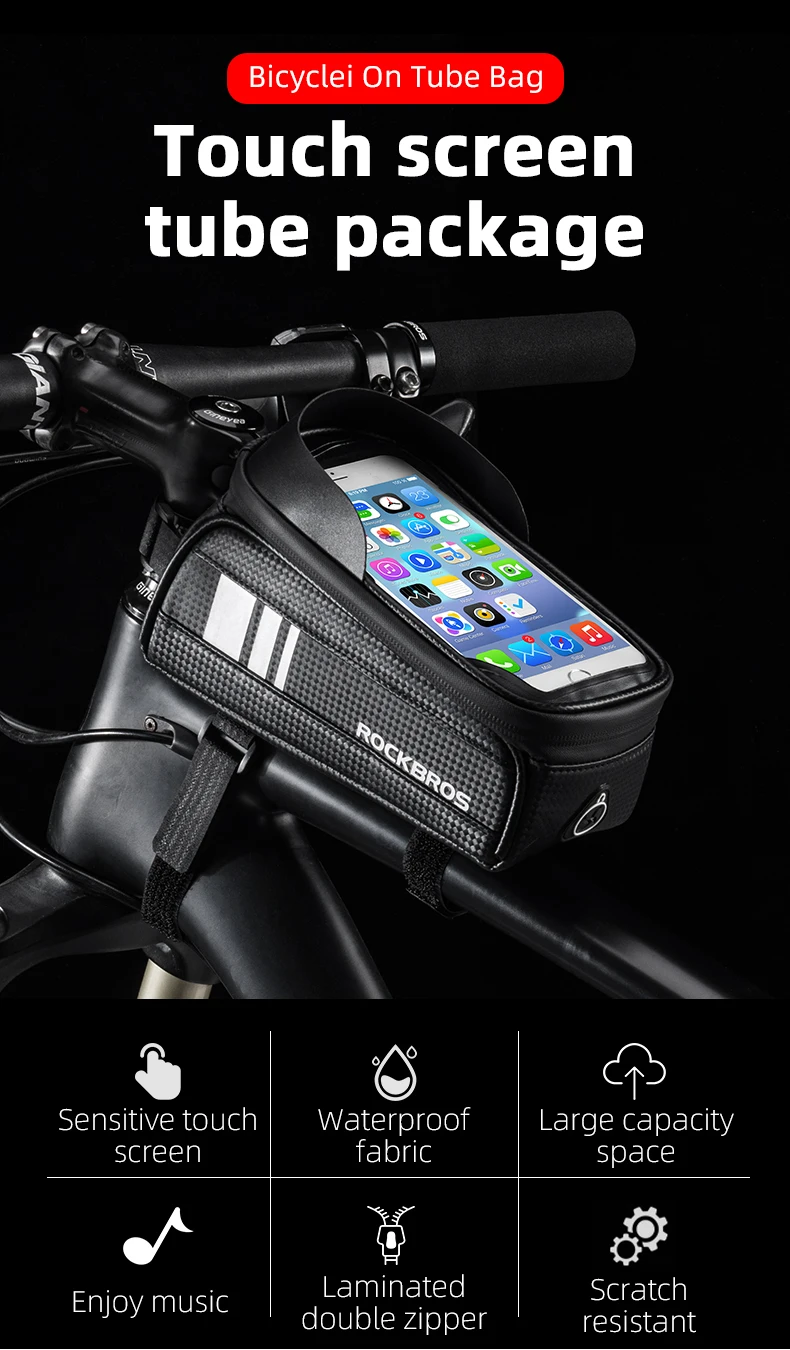 $ 14.36 (Color: 017-5) Покупаю для велосипедов только сумки ROCKBROS, т.к. качество на высоте, и мне важно, чтобы боковые стороны были твердые. Эти сумки водонепроницаемые (в комплекте есть доп. чехол от дождя, натягивается сверху. Также есть козырек (от бликов солнца немного защищает). Тач работает не особо чувствительно, но для пролистывания и вызова приложений вполне сойдет. Вмещаются телефоны с дисплеем 6.7 " в чехле. Сбоку шов сделан светоотражающей лентой. Замки с внутренней собачкой. В данной новой модели снизу липучка сплошная, но при желании можно разрезать, если мешает крепление тросиков. Так же в новой модели открывается сумка сверху, а не сбоку как в 017-1bk 6.0inch и 017-3bk 6.0inch. Отверстия для провода наушников зачем-то снизу имеется. Стирается сумка дочиста, пленка остается чувствительной на тач. За два сезона проблем не выявлено. Продавец спасибо!