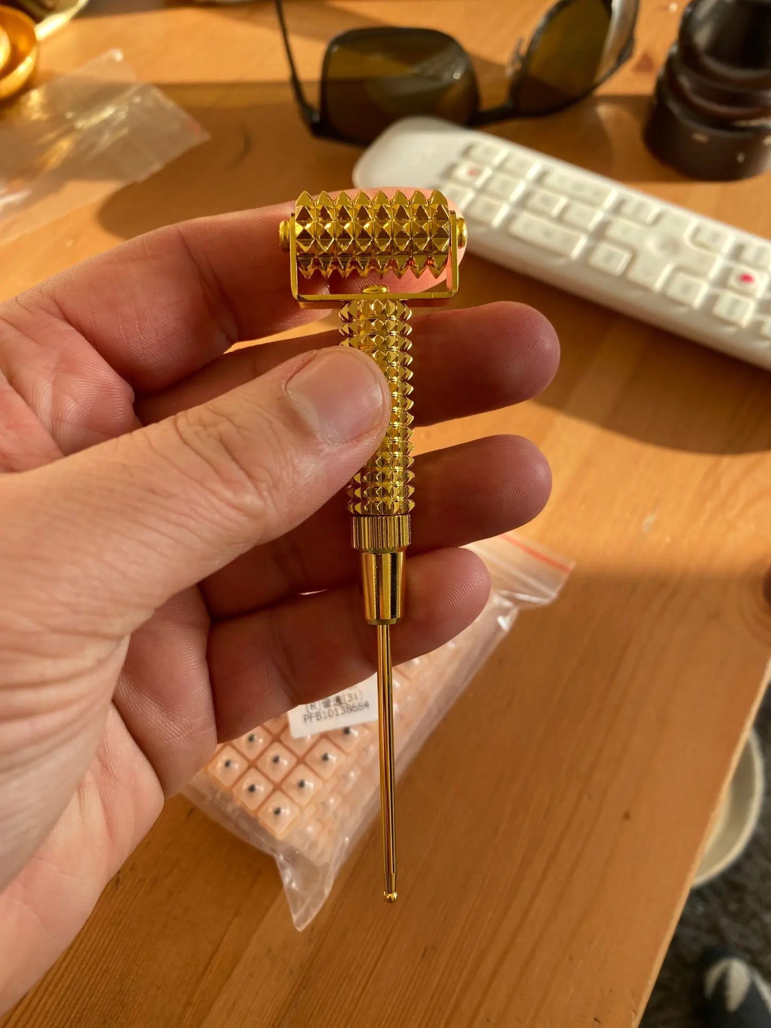 Маленький , аккуратный . Пришёл самый первый из всех заказов на 11.11. Акупунктурная палочка приятно пружинит, роллер слегка скрипит при использовании, но не критично. Понравился, рекомендую, похожий прибор видела в использовании сети Бьюти-баров в Москве. Довольна, рекомендую.