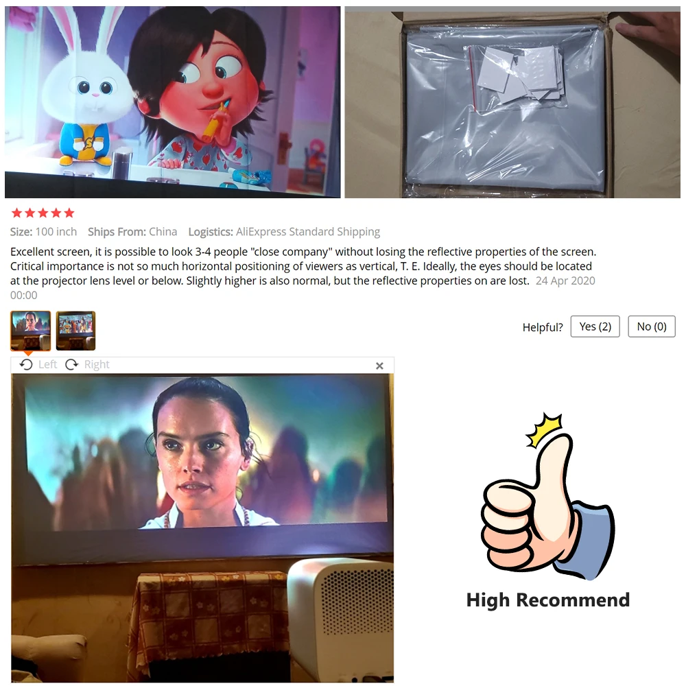 Очень быстрая доставка, буквально неделя. Делаю рамку потихоньку. Так и не понял какой стороной клеить, которой свет отражает или не отражает?) Угол ппц маленький у той что отражает. Но она и является темной стороной. Дезинформируют сюка. Я кнш в шоке какой здоровый он получился, и это я ещё сделал 250х160, а не 290х170. Брал 130", погорячился чёт. А возможно и нет, проектор ещё едет. Кстати не советую брать это говн#ще 1LCD, это пылесосы игрушечные, лучше возьмите DLP б/у с Авито, я взял Optoma HD144X с яркостью 3200 ANSI лм(это в 5 раз ярче китайских 7000) за 24000. Контрастность у моего 23000:1, у китайских 8000:1. Надеюсь кого то отговорю от покупки хрени из под китайца)) Там сами думайте)
