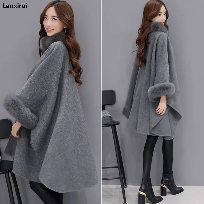 Пончо и накидки для женщин Рождественская мода с расклешенными рукавами воротник из искусственного лисьего Меха Зимняя шерстяная накидка пальто пончо длинное пальто