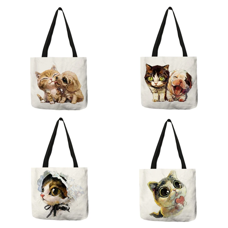 Экологичная льняная многоразовая сумка для покупок с принтом кошки собаки, женские модные повседневные сумки, студенческие дорожные школьные сумки, Прямая поставка