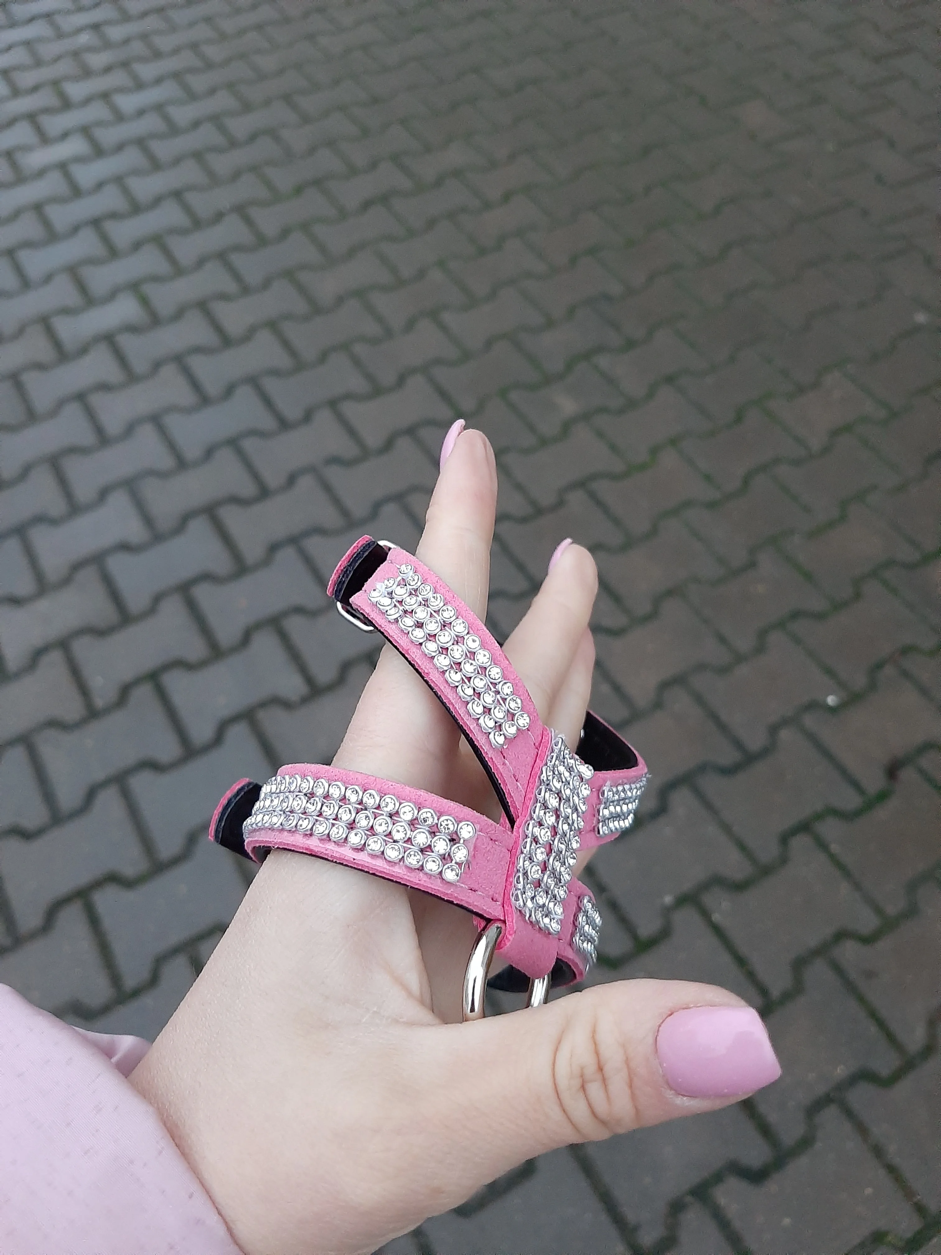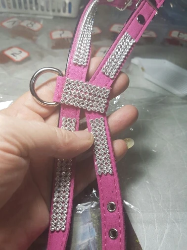 супер шлейка! покупала размер М, на пуделя весом в 2 кг. качество хорошее, стразы приклеены. купила уже много