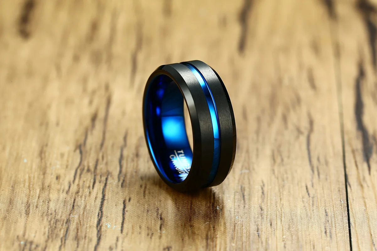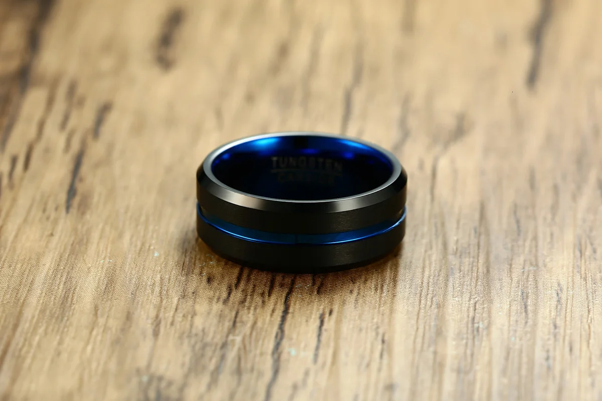 Мужскоеженское кольцо из углеродного волокна, с синим вольфрамовым ...