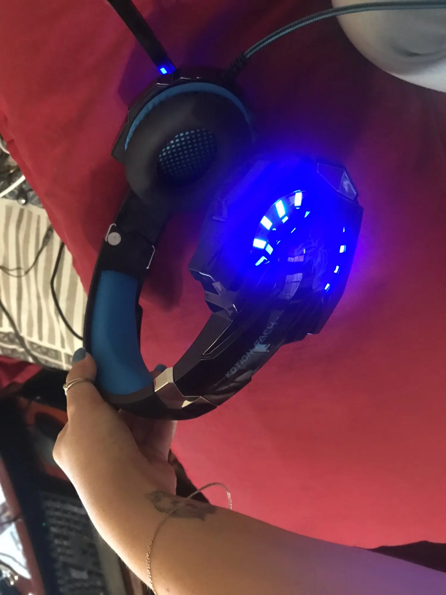 Идеальная гарнитура, как на фото, удобная с хорошим звуком, жаль, что для света необходимо подключиться к USB, потому что трудно подключить разъем и USB одновременно