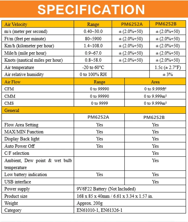 PM6252A 6252B измеритель-это цифровой анемометр для измерения температуры окружающей среды, влажности, температуры точки росы, температуры влажной лампы, скорости ветра и объема воздуха