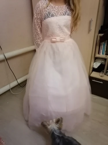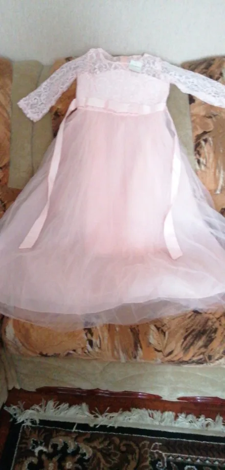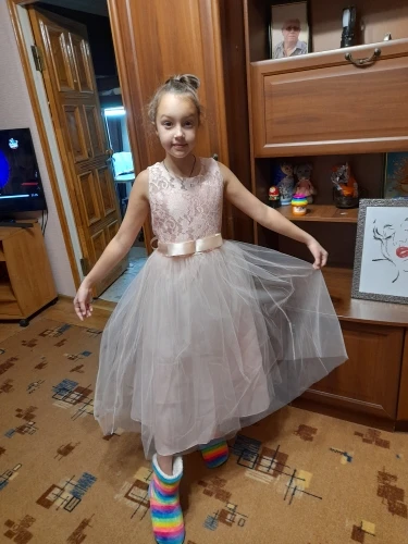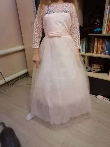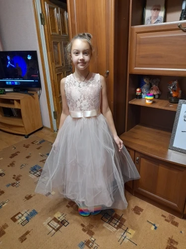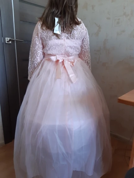 платье ожидаемо хорошее. цвет порадовал, приятный, персиковый. на рост 140, полненькая девочка подошел. на фото не отпареное, с подъюбником. без подъюбника смотрится лучше, аккуратнее и нежнее. продавец отзывчивый, отвечал на все вопросы и волнения. в Московскую область доехало, буквально, за 1,5 недели. советую однозначно иипродавца и платье.