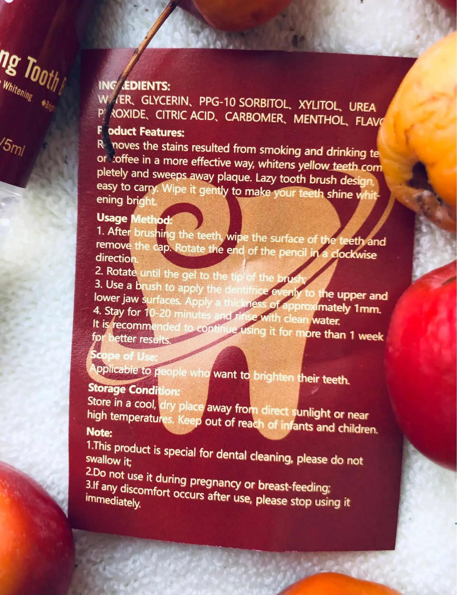 Доставка около месяца. Коробка упакована в слюду, имеется срок годности. На конце кисточка, нужно нанести гель на зубы и оставить на 10-20 минут, затем прополоскать рот водой. Гель прозрачного цвета, без вкуса и без запаха. Объём 5мл. Средство помогает осветилить зубы на пару тонов
