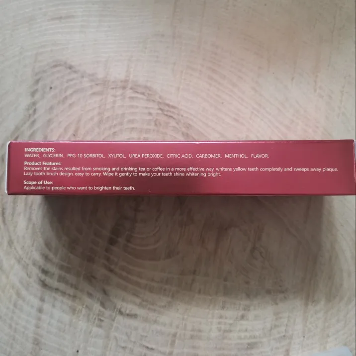 Средство для домашнего отбеливания зубов, что представляет из себя ручку с налитой внутрь прозрачной жидкостью. Доставляют средства быстро, буквально за 2 недели и всегда в отдельной коробочке. На ней указан срок годности и состав продукта. Заявленные ингредиенты: вода, глицерин, лимонная кислота, ментол, сорбитол, перекись мочевины (антисептическое средство) и ароматизатор. Средство щадящее, предназначенное именно для легкого и бережного отбеливания зубов на один/два тона. Форма выпуска интересная - похожа на ручку с кисточкой. Спокойно помещается в руке, держать удобно. Даже после вскрытия закручивается герметично можно спокойно брать с собой класть в сумку и не бояться что вытечет. Запах свежий, отдалено напоминает лимон. Средство убирает налёт от красящих напитков таких как кофе, соки или чай и устраняет желтизну эмали.