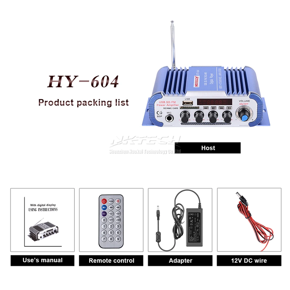 Входное напряжение: 12 В/5 А постоянного тока.Частотный диапазон: 20 Гц-20 кгц.Выходная мощность: RMS 45 Вт x 4.Гармоническое искажение: < 0.05%.SNR: 85 дБ.Высокий контроль: 12 дБ ± 10 кгц.Управление низкими частотами: 12 дБ ± 100 гц.Уровень сигнала: 220 МВ 47K.Диапазон частот FM: от 87,5 МГц до 108,0 мгц.Формат чтения U-disk: MP3/FM.Канал: 4.Импеданс: от 4 до 8 Ом.Материал: алюминиевый корпус. Примечание:Пожалуйста, внимательно прочтите инструкцию перед использованием. Адаптер 12 В, 5 А (подходит для HY-504/HY-604/Lepy LP-168S/LP-269S). ПосылкаЕсли вы выбираете без адаптера:1 x Цифровой усилитель-плеер NKTECH HY-604.1 x Руководство пользователя на английском языке.1 х пульт дистанционного управления.1 х соединительный провод. Если вы выбираете адаптер 12 В, 5 А:1 x Цифровой усилитель-плеер NKTECH HY-604.1 x Руководство пользователя на английском языке.1 адаптер 12А/5А.1 х пульт дистанционного управления.1 х соединительный провод.