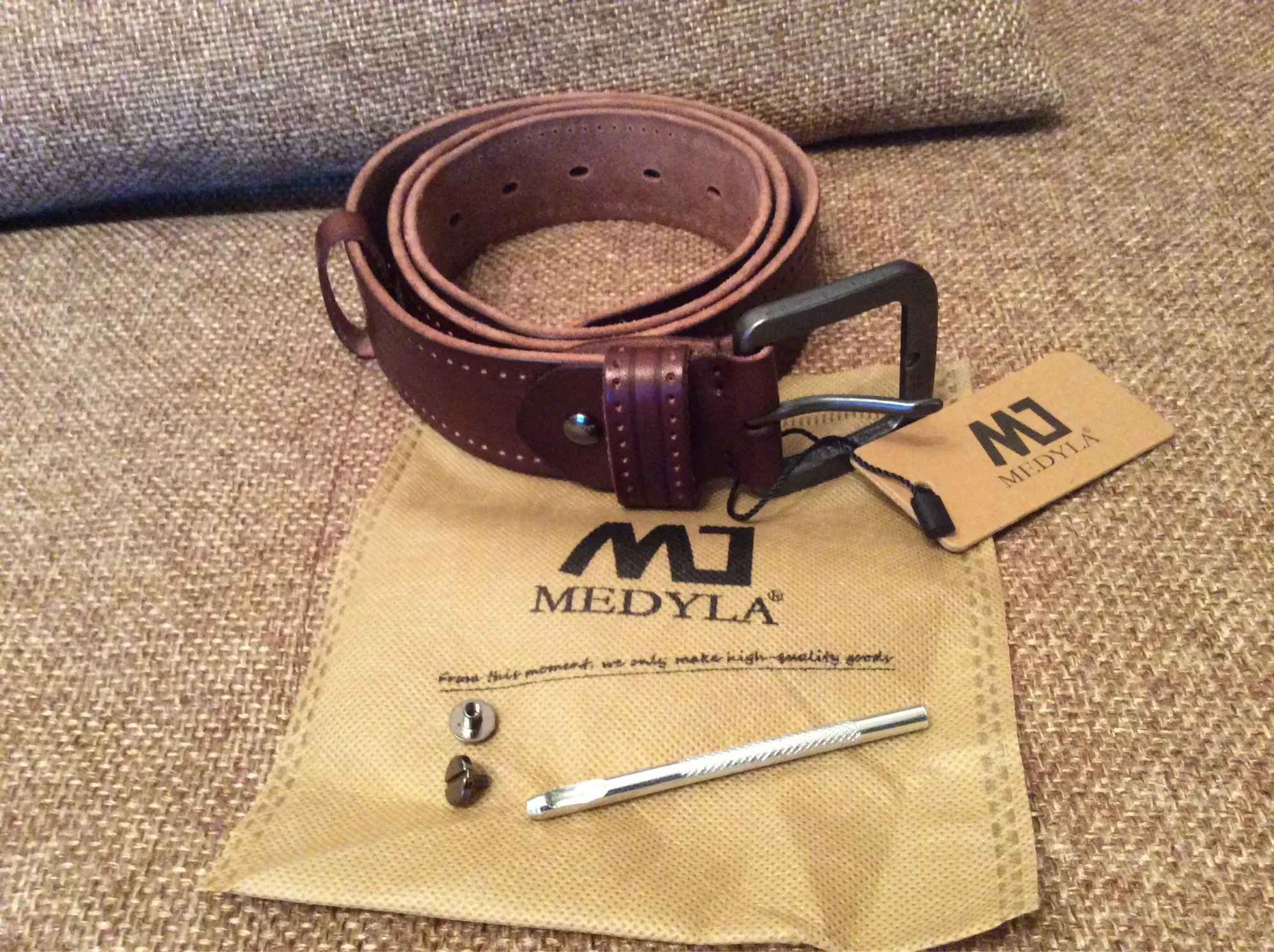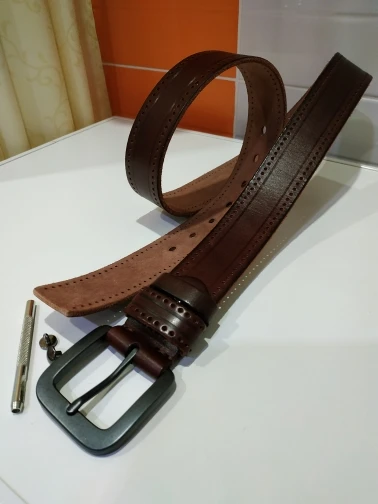 Ремень отличный.Натуральная кожа.С ремнём пришел пробойник.Все супер.Муж доволен.Спасибо продавцу.Рекомендую.