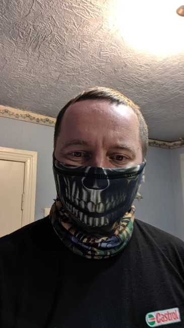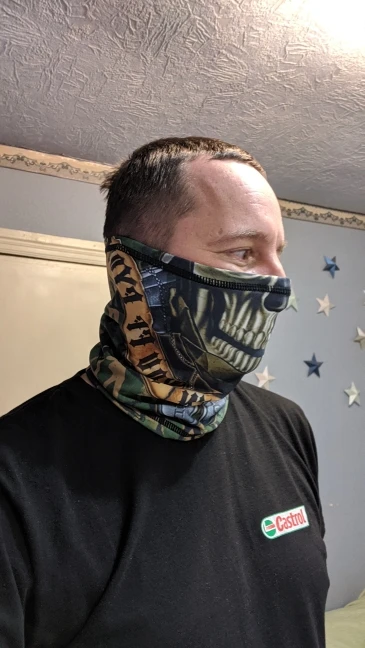 Хорошая маска, горло закрывает, удобно пользоваться. Но мой косяк, что я взял с носом, можно ровно одеть только перед зеркалом, а если где-то на улице, ровно не одеть, поэтому лучше брать с хаотичным рисунком, но смотрится эффектно материал не флис, но мягкий, достаточно приятный к лицу. Ещё минус, что внутренняя сторона белая
