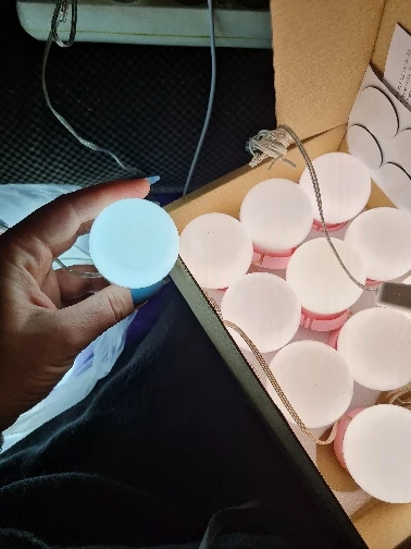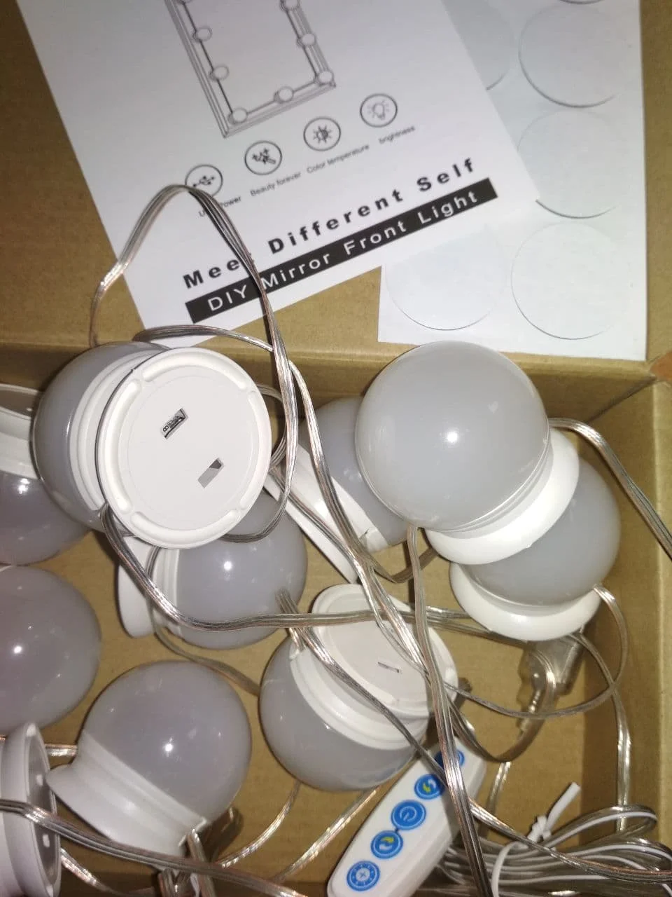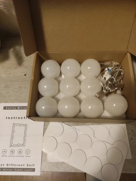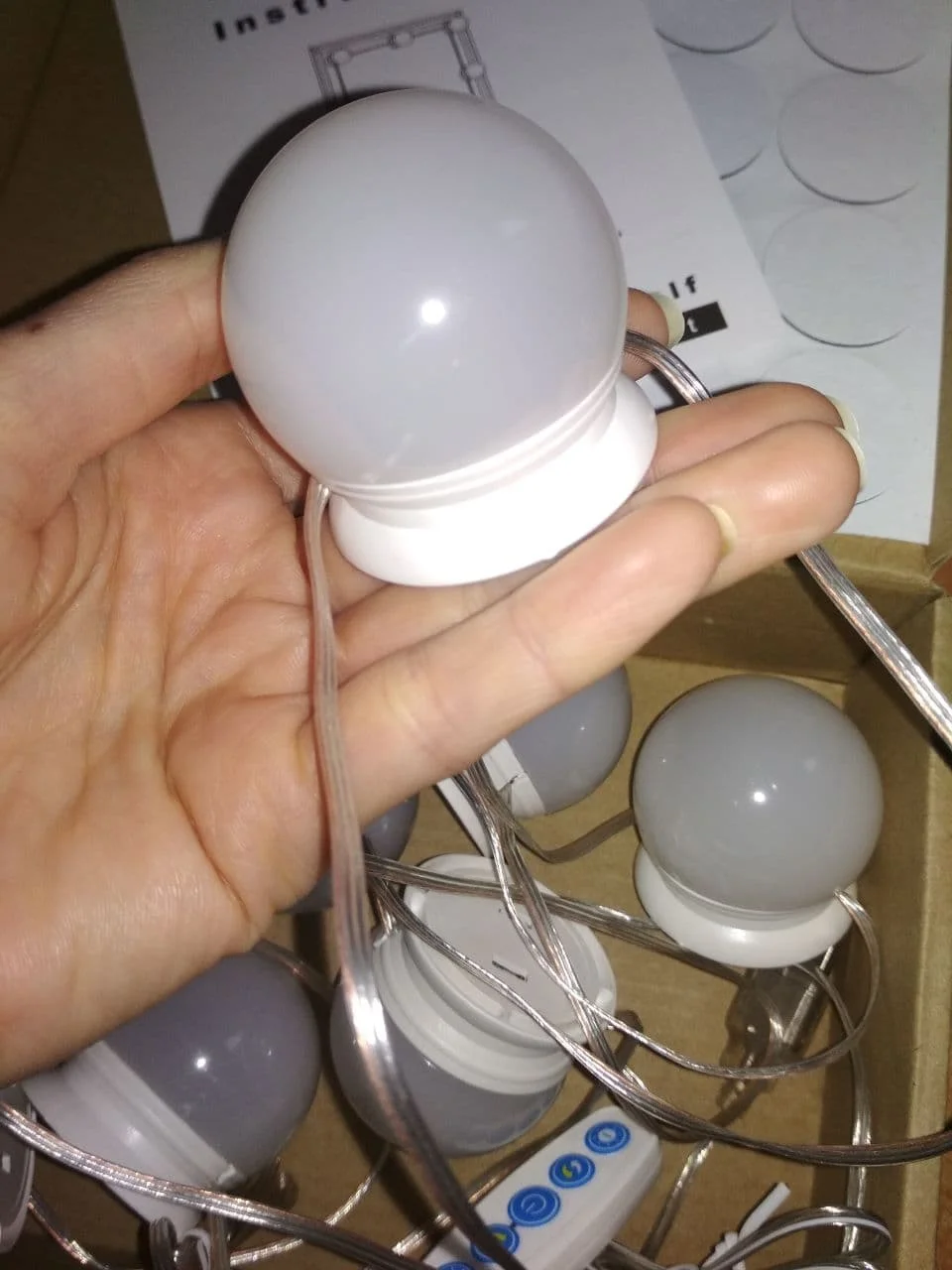 geniales!!! son las segundas que compro, tienen varias regulaciones de intensidad y color , trae unas pegatinas de doble cara para poder fijarlas al espejo, esta vez ha llegado la caja un poco doblada, pero las bombillas han llegado en perfecto estado , y el envio súper rápido, recomiendo vendedor