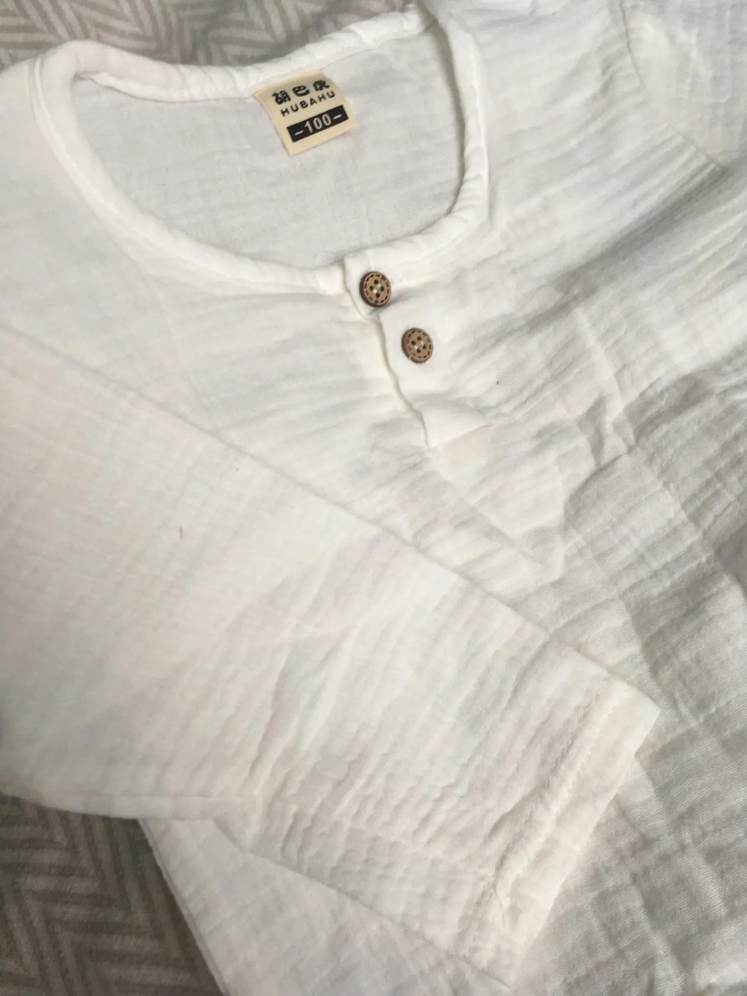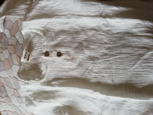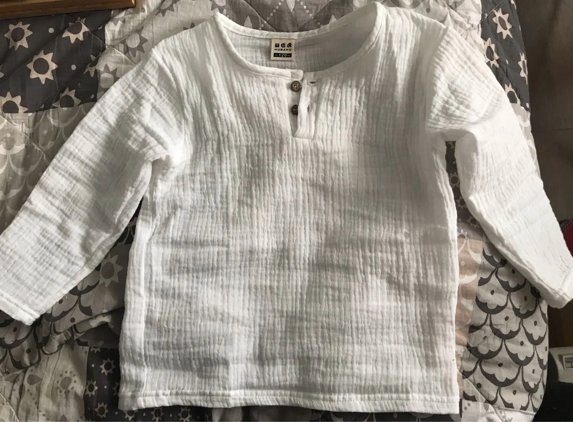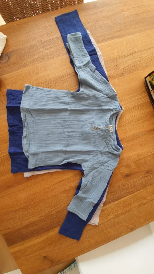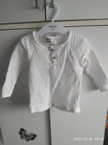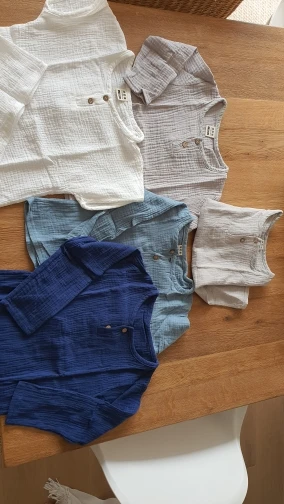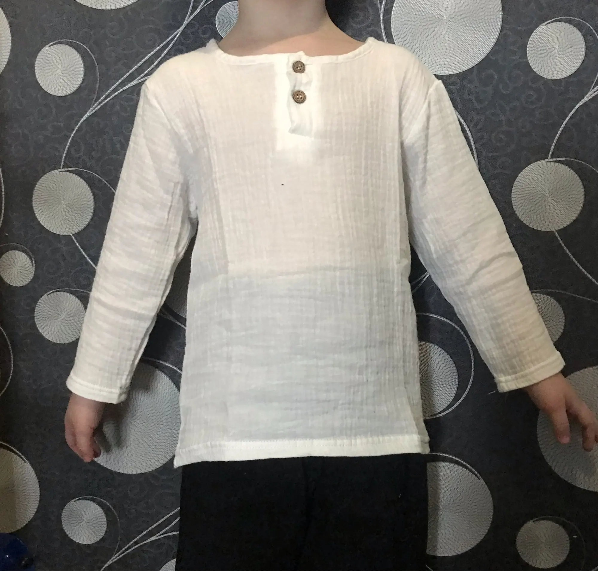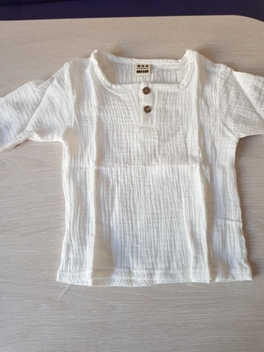 Чудесная рубашка. Приятный к телу муслин. С размером только сложно угадать. Ребёнок 108 сейчас, взяла 120, достаточно широкая, рукава коротковаты, но не узкие. Но за счёт материала всё равно смотрится хорошо, возьму ещё одну) Ниточки торчат, если кому важно)) Доставка быстрая. Спасибо!