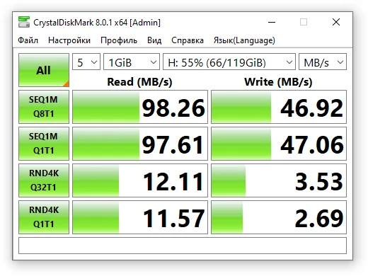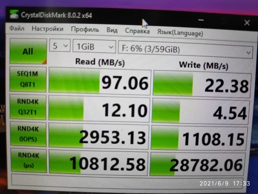 Адаптер поставляется просто в пакетике. Продавец использовал почтовый пакет с пупырчатой прокладкой, поэтому товар дошел без каких-либо повреждений. Скорость держит. Прикладываю скриншот теста CrystalDiskMark с картой памяти Samsung EVO 128 ГБ. Основная проблема - нагрев! Например после теста кардридер невозможно взять в руки. Советую делать периодические паузы или пользоваться менее "горячими" картами памяти.