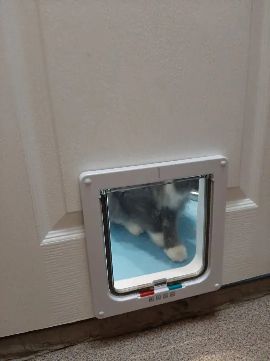 дверка качественная, крепёж в комплекте. чтобы научить кота на первое время можно вытащить магнит - проще открывать