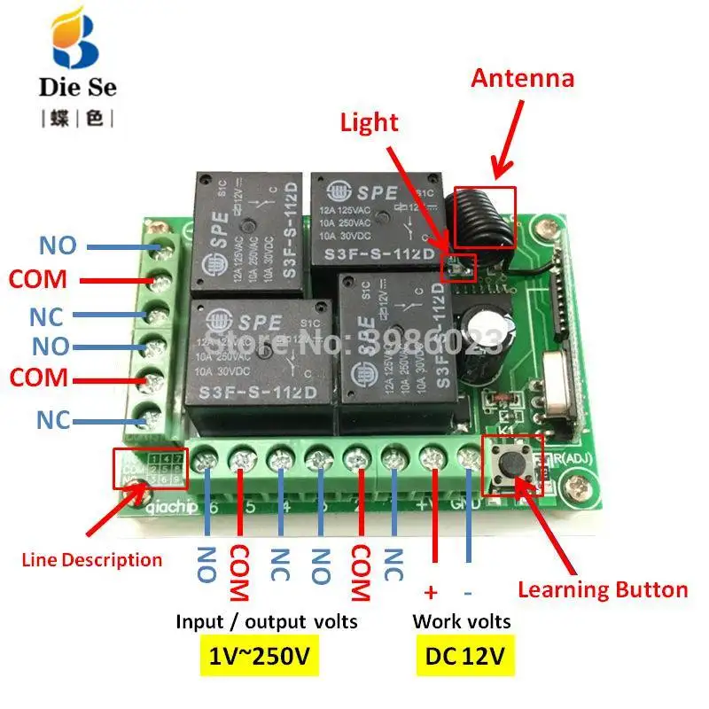 Я думал, что могу использовать каждое отдельное реле и защелкивать их 2 кнопками передатчика. Неправильно! Вы можете использовать только защелку с помощью реле, а не с помощью кнопок. Если вы фиксируетесь, то дает только 2CH (2x2 реле) Если вы переключаете, он дает 4CH (4x1 реле) Поэтому я должен был изменить свою политику, и я продумал это ........