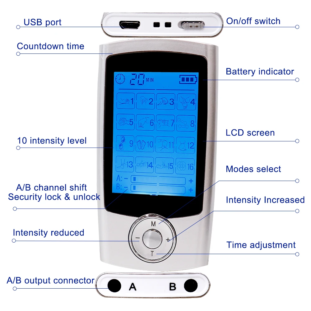Электрический миологический стимулятор тела, 16 режимов, двойной выход, EMS, электронный импульс массажер для физиотерапии