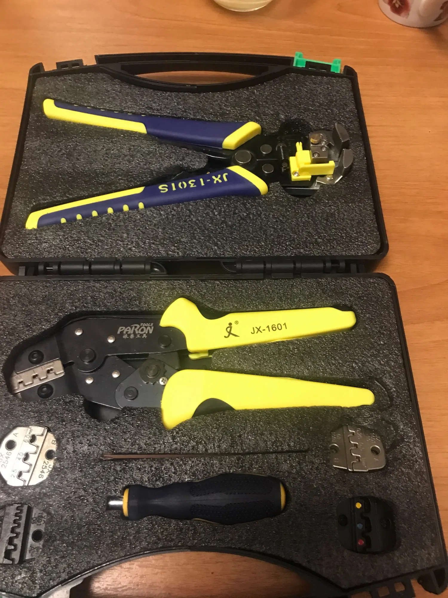 Эти профессиональные инструменты для обжима проводов с саморегулируемыми обжимными плоскогубцами и зачисткой проводов отличаются удобством, эффективностью и безвредностью для сердечников кабеля. Он прост в использовании, просто держите ручку и манипулируйте ею один раз, чтобы успешно нажать плотно на провод и клеммные колодки.Особенности:С 5 сменными клеммами с различными диапазонами обжима.Профессиональный инструмент для обжима проводов с саморегулируемым храповым механизмом для удобства эксплуатации.Применимо к большинству неизолированных обжимных клемм и разъемов.Многофункциональный инструмент для зачистки проводов с модернизированной конструкцией и более удобной ручкой для проводов от 24 до 10AWG (0,2-6,0 мм ⊃ 2;).Благодаря отличному хватательному положению ручки, легкая и компактная структура и конструкция ручки обеспечивают идеальный эффект обжима.Разработан в соответствии с инженерными факторами человека, он может сэкономить 50% энергии при обжиме.Пластиковый ящик для инструментов имеет Водонепроницаемость поверхности и больше подходит для переноски и длительного хранения.Характеристики:Название бренда: PARONМодель: JX-D5301SМатериал: Высокоуглеродистая сталь + сплавЦвет: желтый + черныйПодходящие клеммы и Диапазон обжима проволоки:JX 1601-01: цветные кодовые гнезда + изолированные клеммы 24-14 AWG (0,25-2,5 мм ⊃ 2;)JX 1601-06: концевые клеммы шнура 24-10 AWG (0,25-6,0 мм ⊃ 2;)JX 1601-08: неизолированный разъем с открытым цилиндром 26-16 AWG (0,14-1,5 мм ⊃ 2;)JX 1601-10: неизолированный разъем с открытым цилиндром 28-18 AWG (0,1-1,0 мм ⊃ 2;)JX 1601-2546: MC4 Солнечный коннектор клеммы 14-10 AWG (2,5-6,0 мм ⊃ 2;)Диапазон зачистки авто проводов: 24-10 AWG (0,2-6,0 мм ⊃ 2;)Размер обжима проводов: ок. 190*80*20 мм/7,48*3,15*0,79 дюймаВес обжима проволоки: ок. 348,5 г/12,29 унцииРазмер автоматического зачистителя проводов: ок. 210*108*28 мм/8,27*4,25*1,10 дюймовВес автоматического инструмент для зачистки проводов: прибл. 316 г/11,15 унцииРазмер посылка: ок. 23,5*18,5*4,5 см/9,25*7,28*1,77 дюймаВес посылка: прибл. 1010 г/35,63 унцииПримечание:Обратите внимание на направление анастомоза штампов и клемм при работе, иначе штамп будет раскрыт.Комплектация:1 * JX-1601 щипцы для проволоки1 * JX-1301S автоматический инструмент для зачистки проводов1 * S2 шуруповерт4 * Запасные штампы4 * винты1 * ящик для инструментов