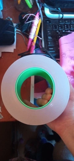 la cinta es delgada con pegamento, perfecta para pegarla yo en las mascarillas,descubrí que debilita el Covid 19 hasta un 70%,dejo el comentario para que las personas sepan, busquen en Google
