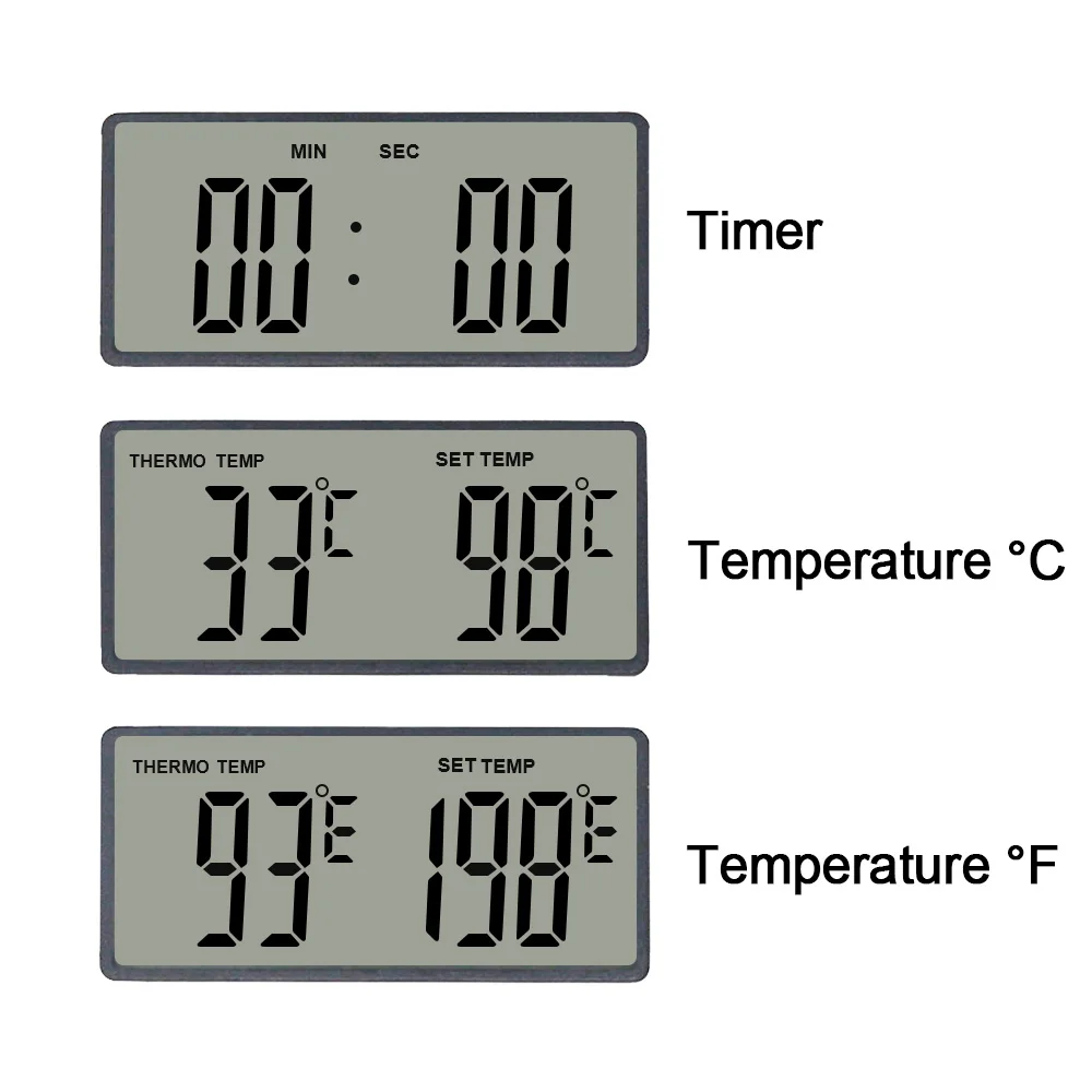 Может работать как термометр или таймер, но не одновременно. На чехле есть магнит и подставка. Дисплей несколько обесцвечивается, а угол обзора узкий. Поставляется в белой картонной коробке.