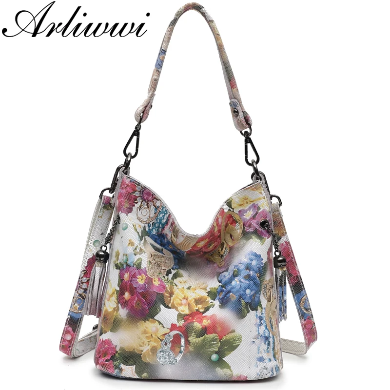 Женская сумка из натуральной коровьей кожи Arliwwi, блестящая дизайнерская сумочка с цветами, модель GY01