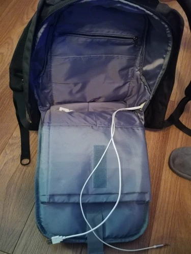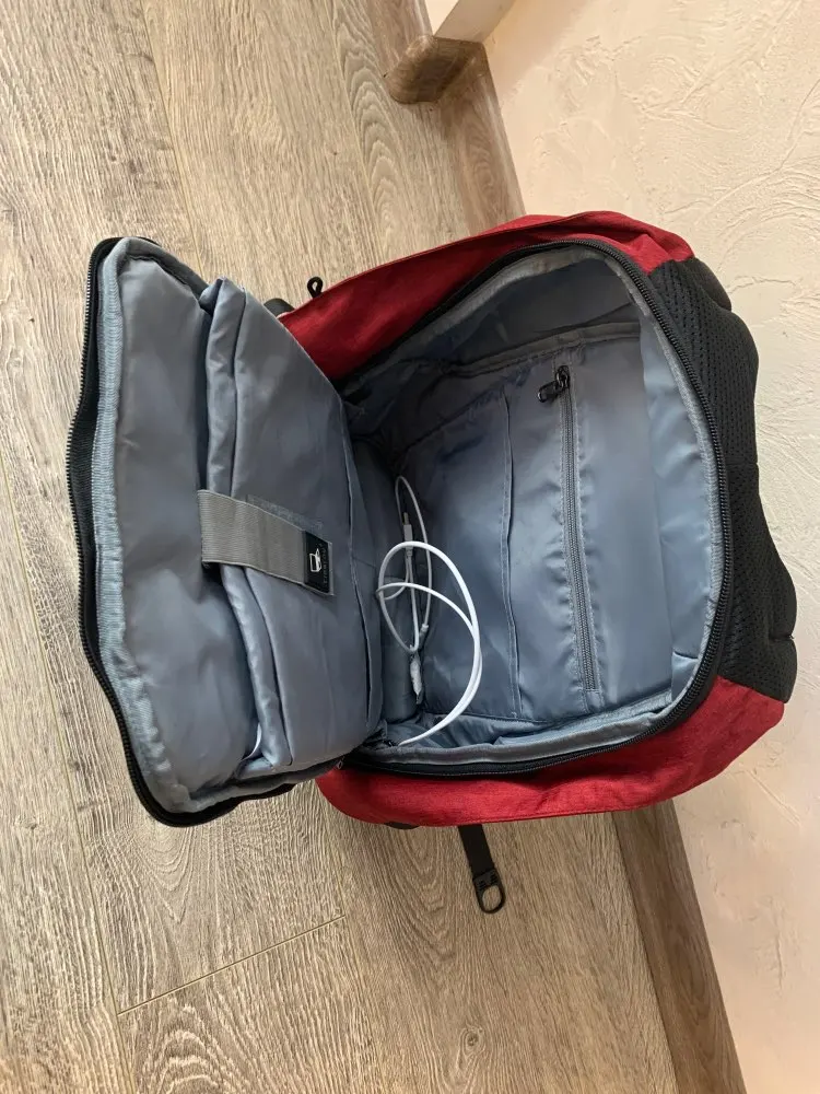 Отличный вместительный рюкзак. Очень удобный. Единственное, зарядка почему-то штекер круглый, для айфона не подойдет. Но вмещается и ноут и вещи, материал качественный, фурнитура хорошая. Рекомендую.