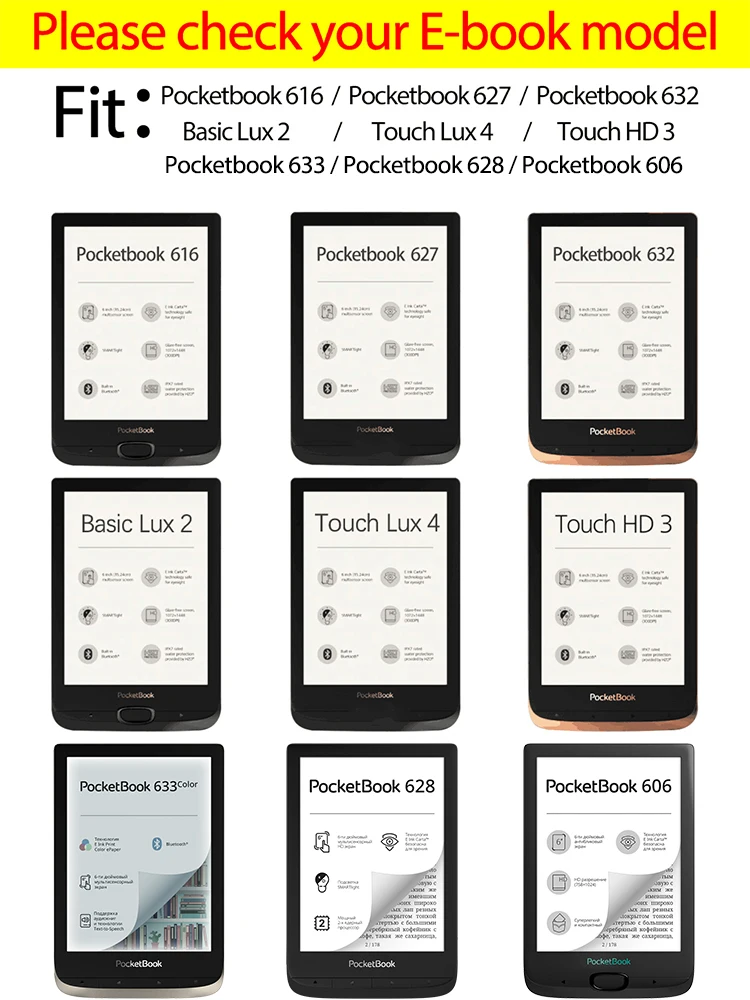 Чехол идеально подходит для Pocketbook Color 633 и поставляется с подарочным стилусом и защитной пленкой. Электронная книга плотно сидит. Магнитная застежка работает, и книга «засыпает» при закрытии. Очень доволен покупкой.