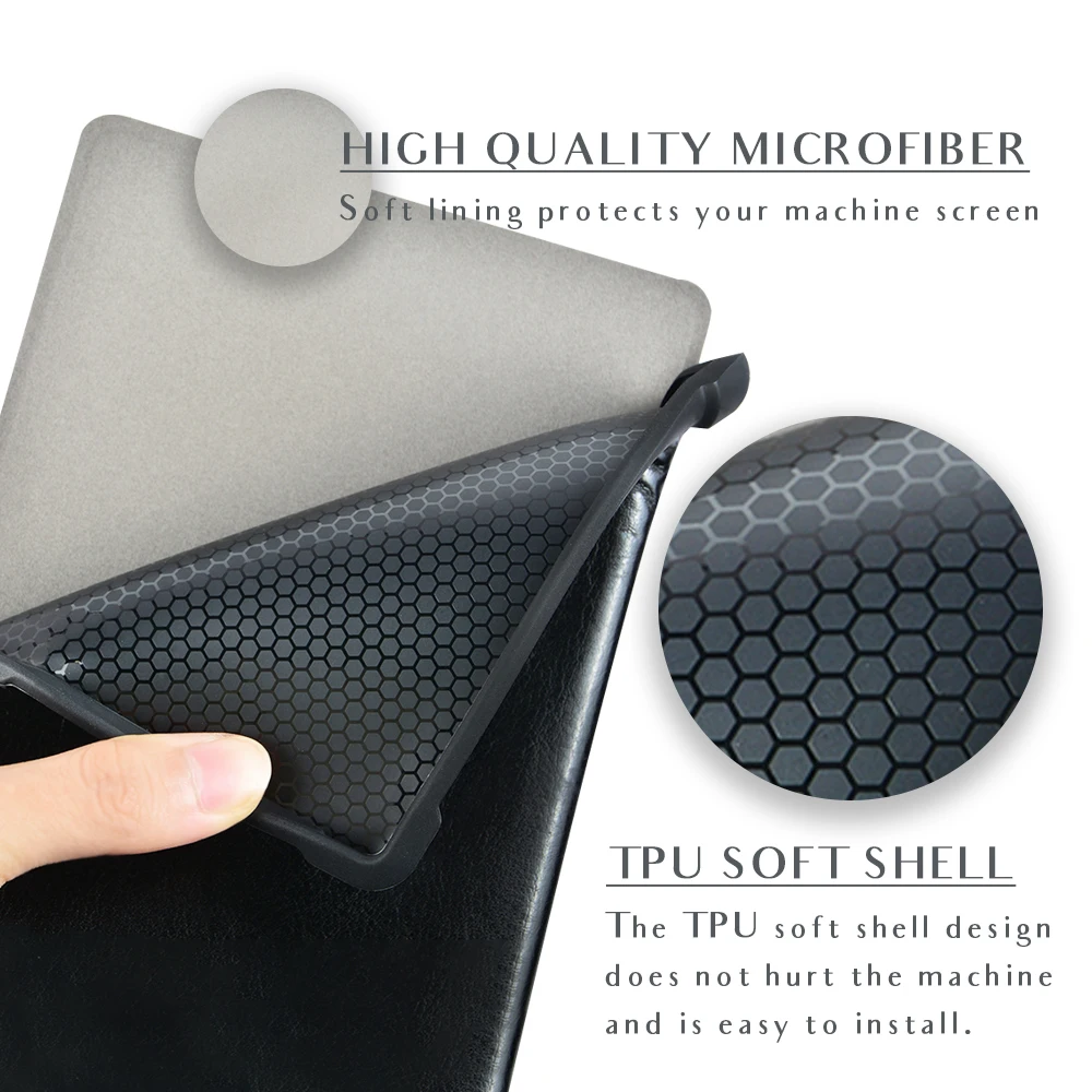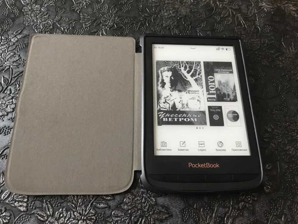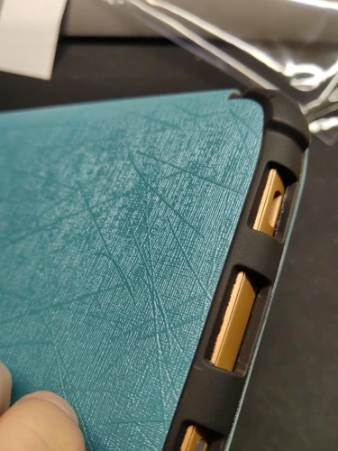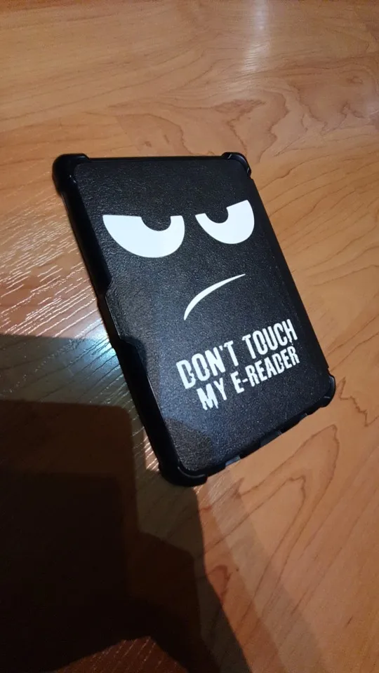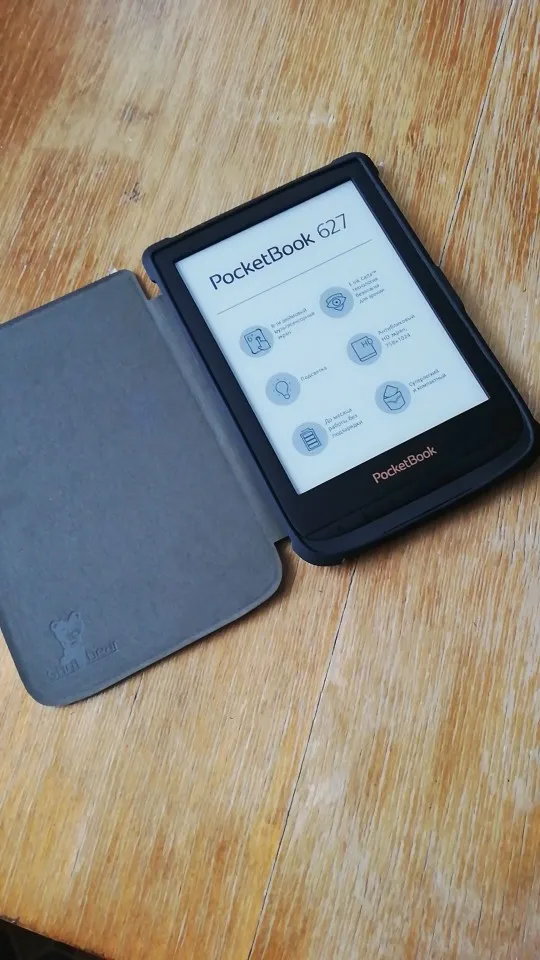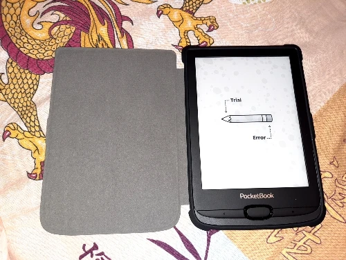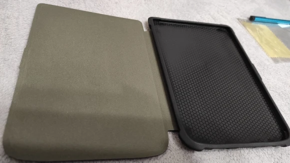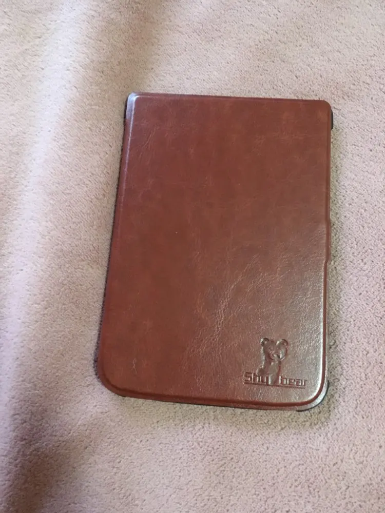 Чехол толстый, мощный. И тяжёлый. Когда читаю лёжа держа книгу в руке на весу становится заметно. Плюс в том, что теперь бросаю в сумку не раздумывая - чехол архинадёжный и прочный. Задняя часть, куда вставляется книга, из тактильного пластика. Могла бы быть потоньше. Снизу есть отверстия под кнопку включения, SD и кабель. Но мой кабель не влез - приходится снимать чехол для зарядки. С задней стороны есть ножки - х3 зачем. У меня 616. Магнитный замок работает - при закрытии книга засыпает. Внутренняя часть обложки на ощуп волосатая.