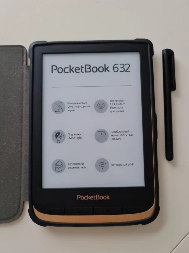 Чехол симпатичный, чувствуется в руках. Единственный минус с Pocketbook 616 это глубокопосаженная кнопка включения - приходится ногтем дотягиваться. Спасибо также за плёнку на экран и стилус!