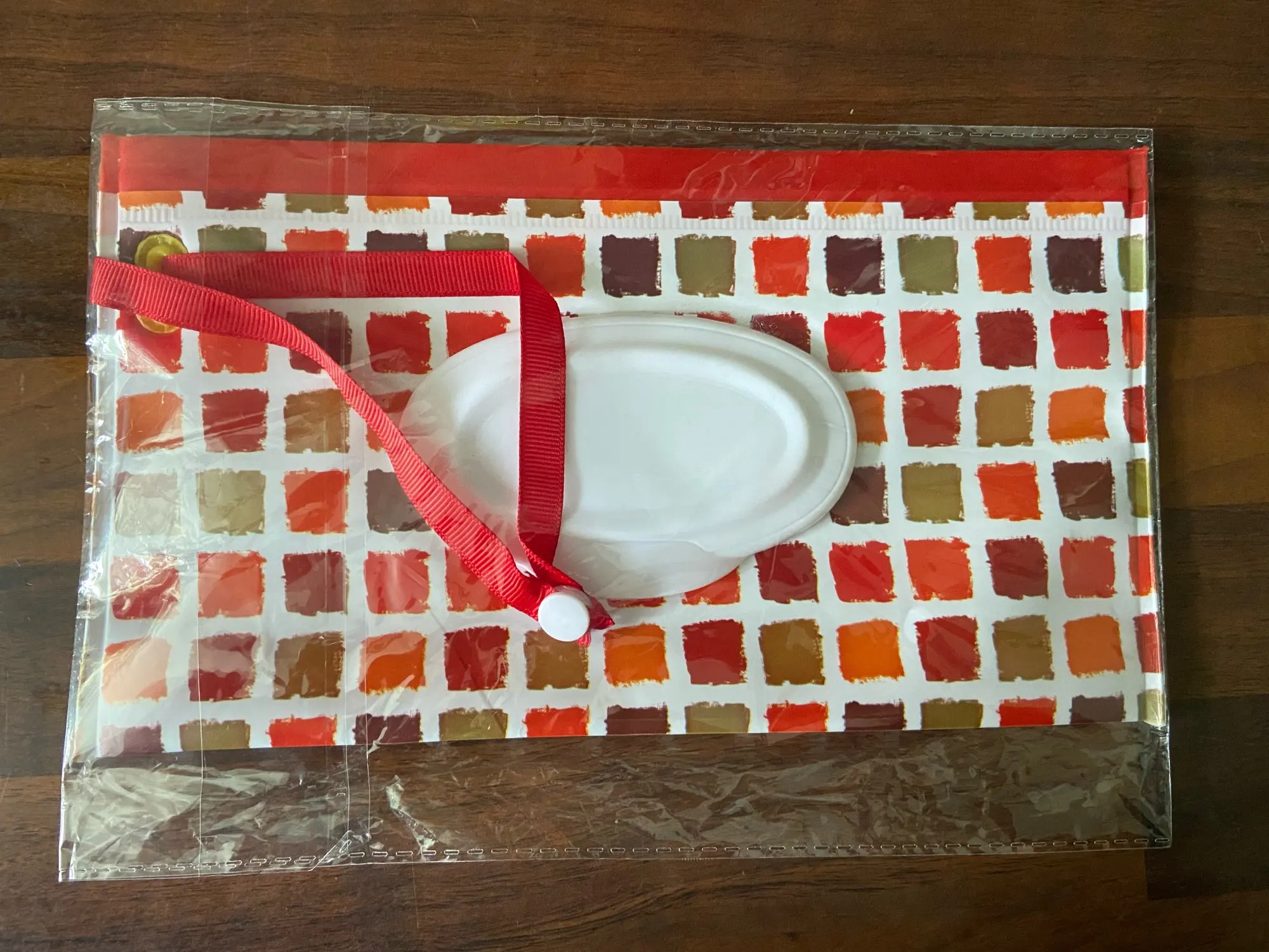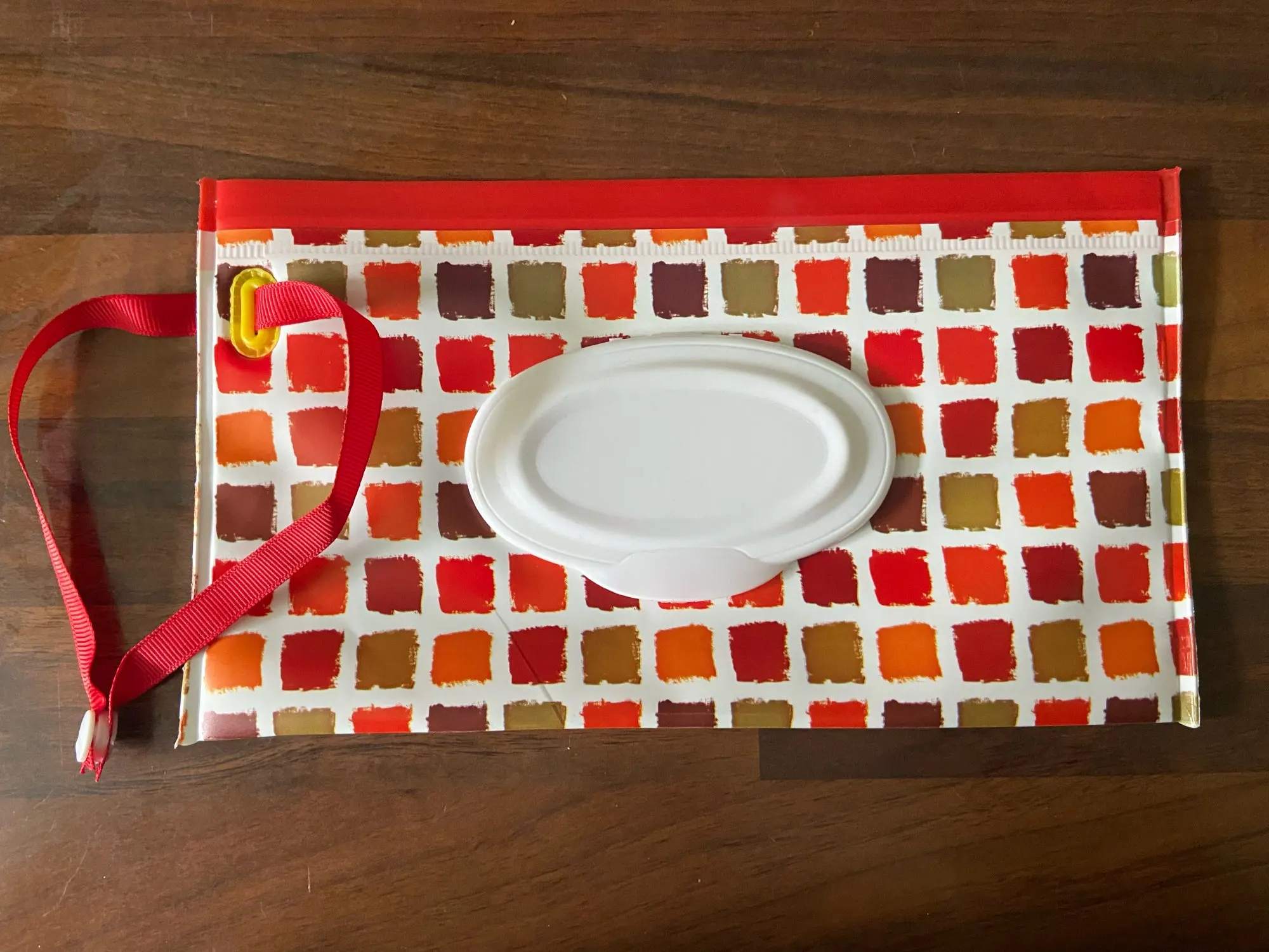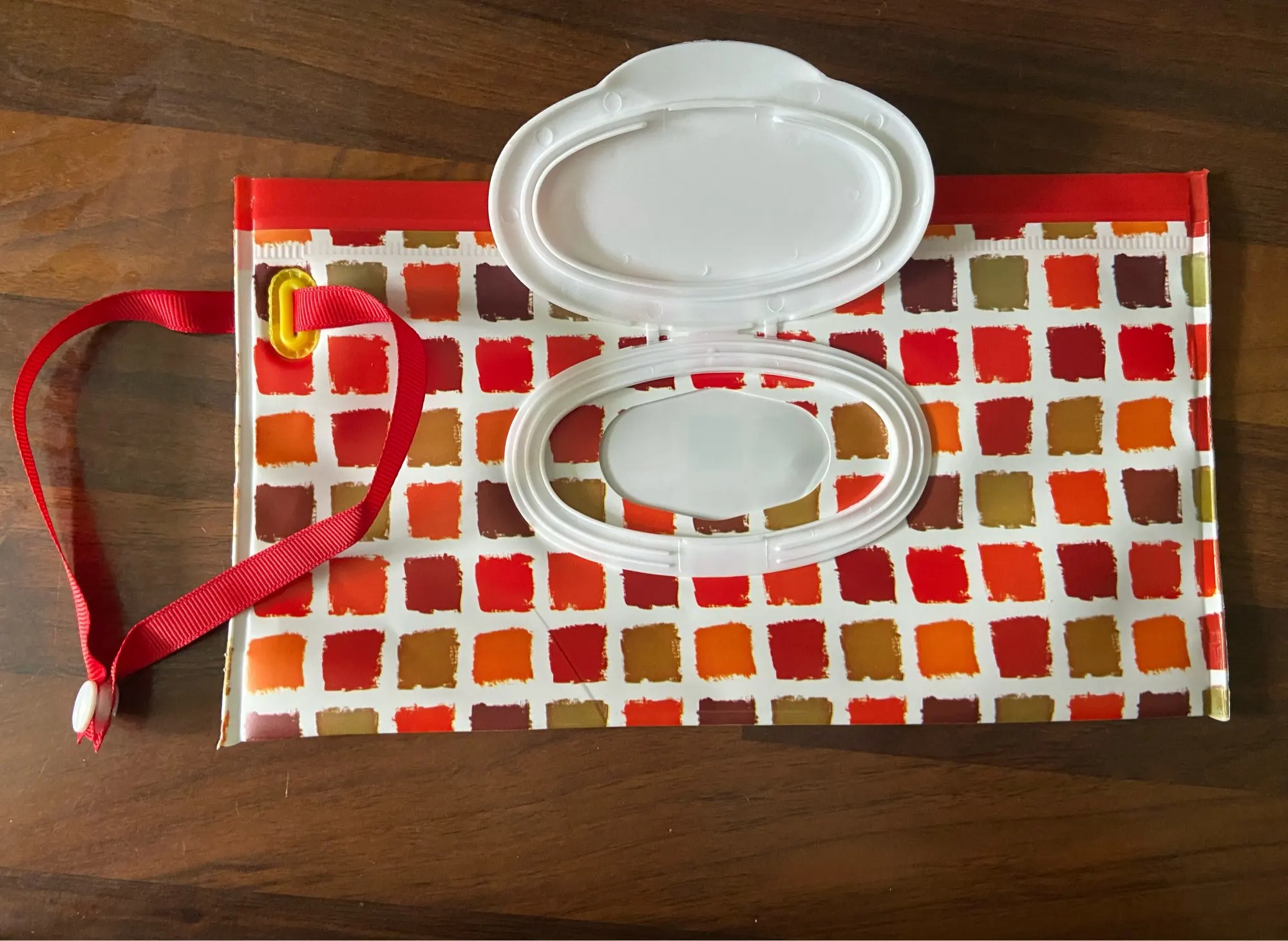 Сумка для белья, как описано. Обратите внимание на очень большие пакеты салфеток (70 салфеток), которые трудно вписаться. Вы должны немного заставить, и поэтому открытие пакета больше не центрировано с открытием кармана. Крышка закрывается очень хорошо.